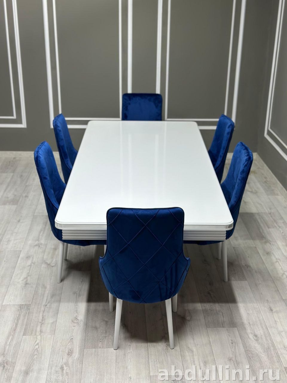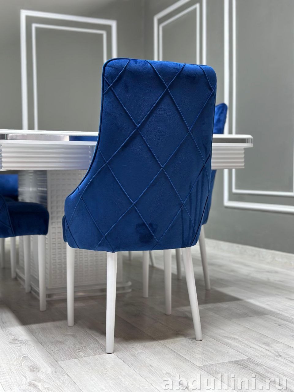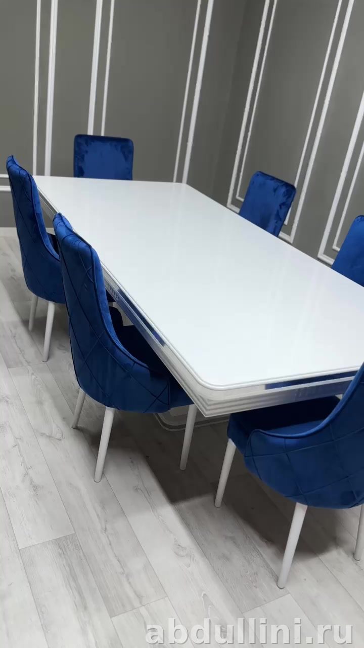 - Стулья: Обивка — бархатная ткань насыщенного синего цвета. Спинка с ромбовидной прострочкой. Ножки — белые, глянцевые.