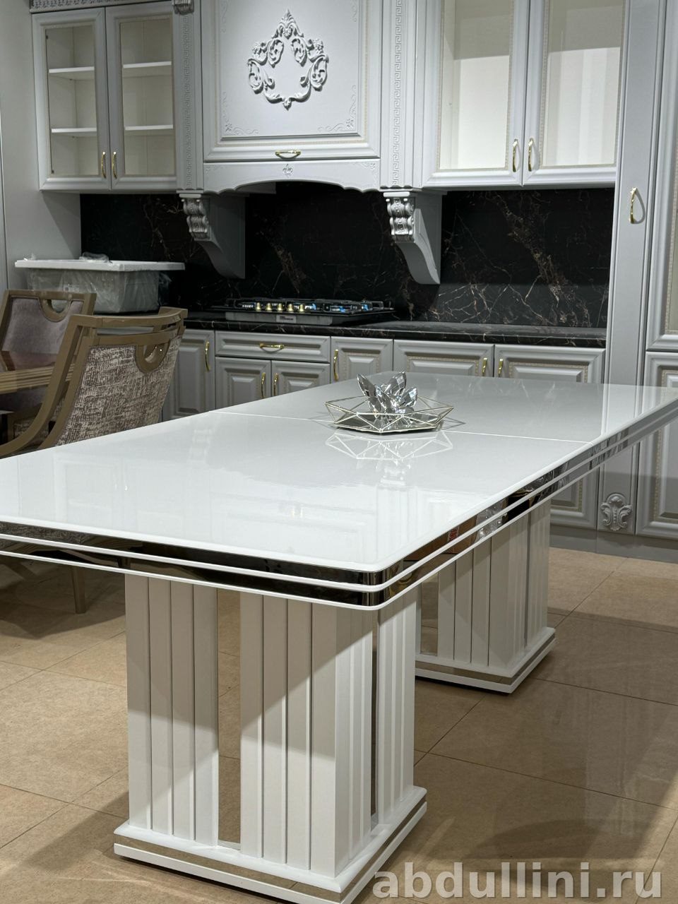 Стол подходит для интерьеров в стиле неоклассики или современных пространств, где важны лаконичность и элегантность. Массивное основание с вертикальными полосами обеспечивает устойчивость и визуальную привлекательность.