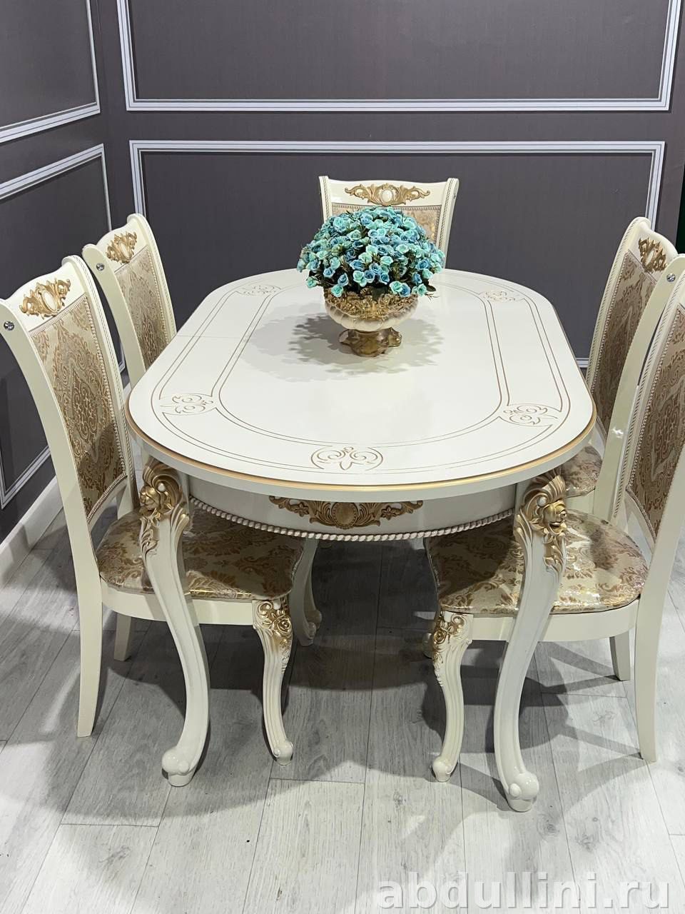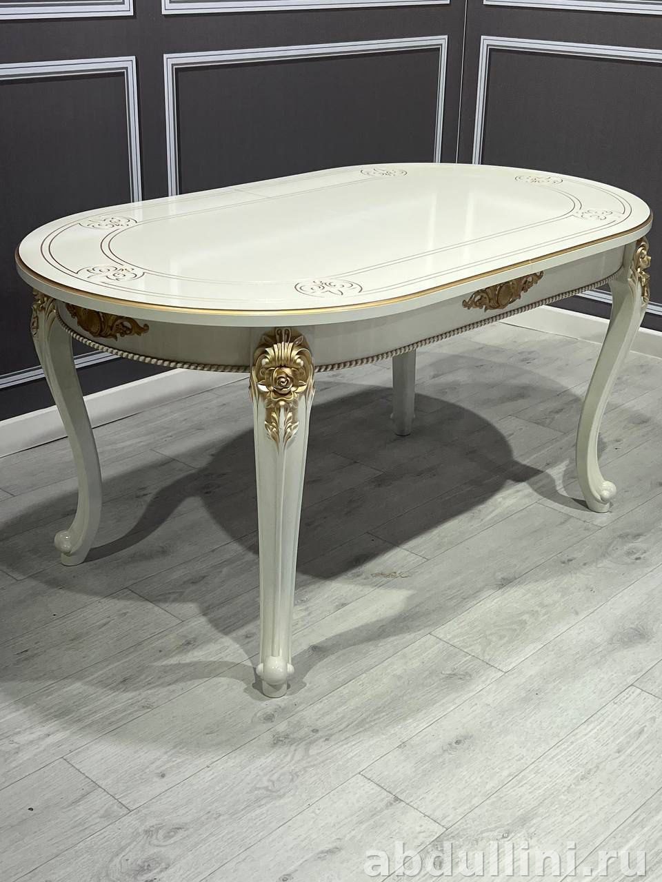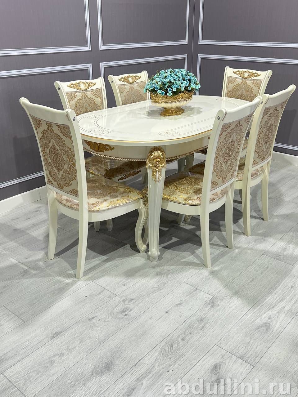 Комплект мебели для обеденной зоны включает овальный стол и шесть стульев. Основной цвет — слоновая кость (кремовый, молочный) с золотистой отделкой. Поверхность глянцевая, с декоративными элементами.