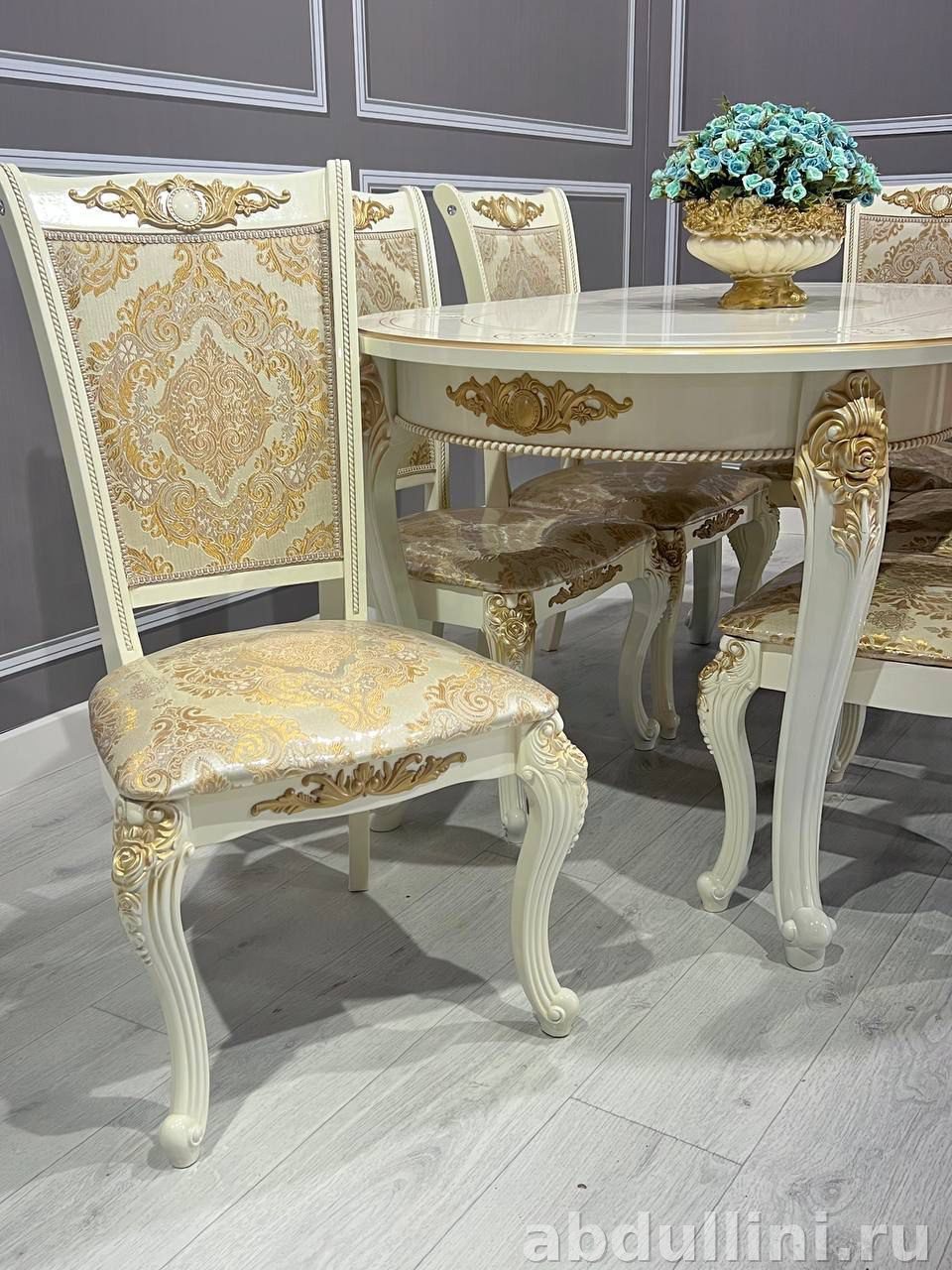 - Стулья: каркас из массива дерева, обивка сидений и спинок — текстиль с золотистым орнаментом.