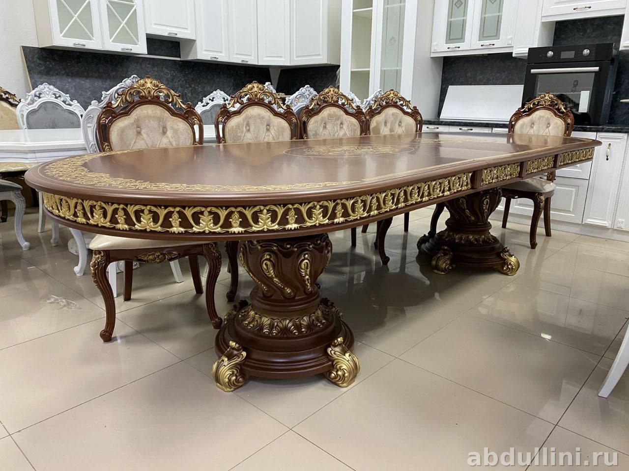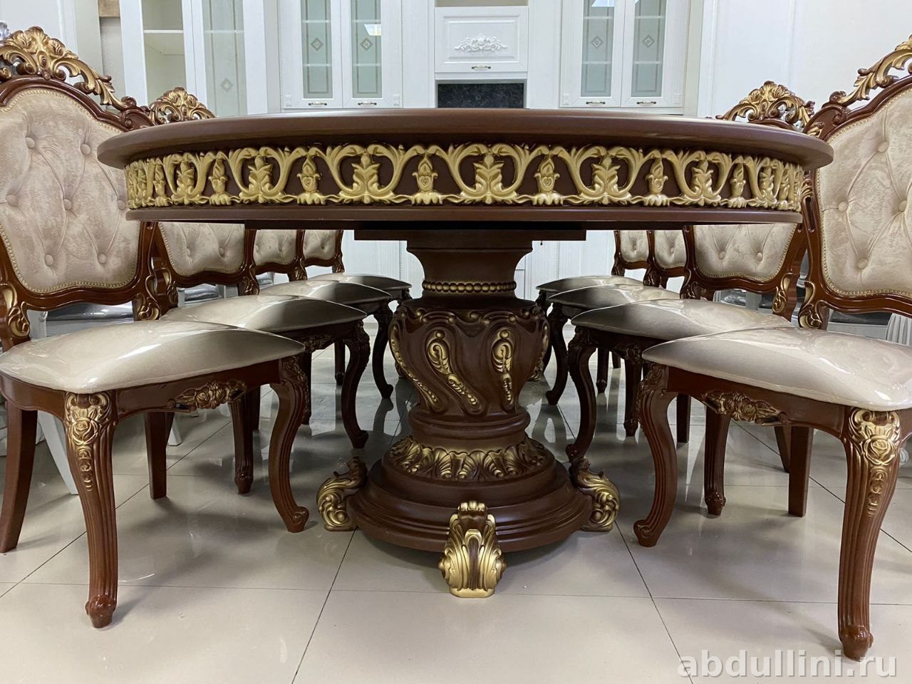 Комплект обеденной мебели в классическом стиле. В набор входит овальный стол и десять стульев с высокой спинкой. Подходит для просторных столовых и загородных домов.
