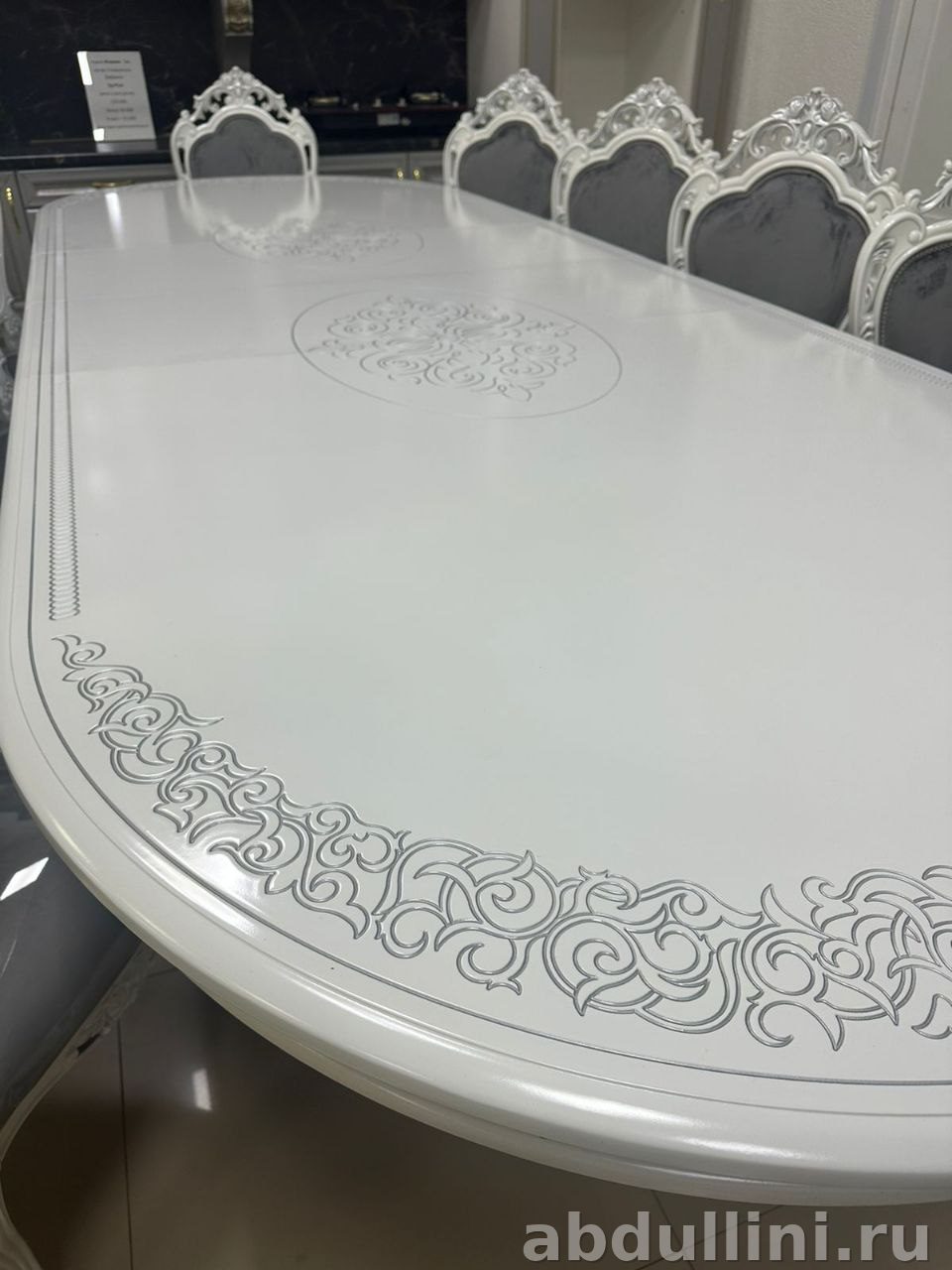 - Стулья «Мини-Шейх»: Каркас — белый глянец, обивка сидений — серая ткань (велюр/бархат). Спинки украшены серебристыми элементами.