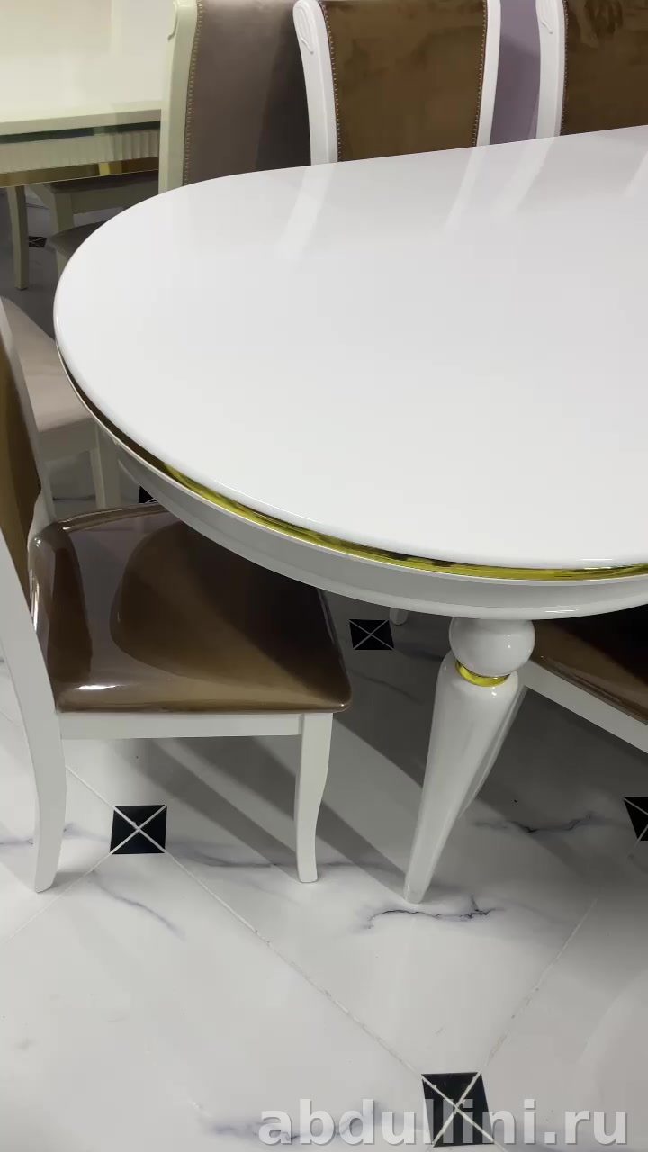 Цветовая гамма выдержана в классическом белом и золотистом тонах. Столешница выполнена из МДФ с глянцевым покрытием, по краю проходит золотистая декоративная полоса. Ножка стола белая, украшена шаровидными элементами и золотистыми кольцами. Стулья имеют высокие спинки с мягкой обивкой из ткани, имитирующей велюр или бархат, в коричневом оттенке. Каркас стульев изготовлен из массива дерева.