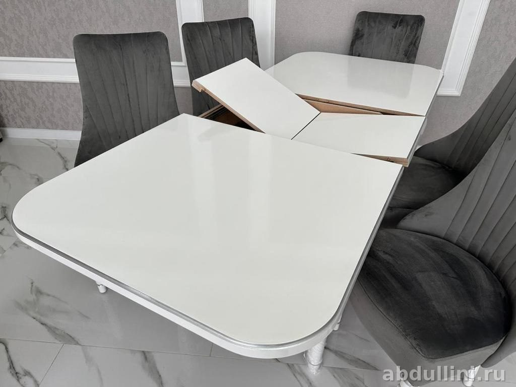- Стол: глянцевая белая столешница, белые ножки с декоративными элементами. Размеры: 160/200 см (цена 24 500₽) или 200/240 см (цена 25 500₽). Раздвижной механизм даёт увеличить площадь столешницы.