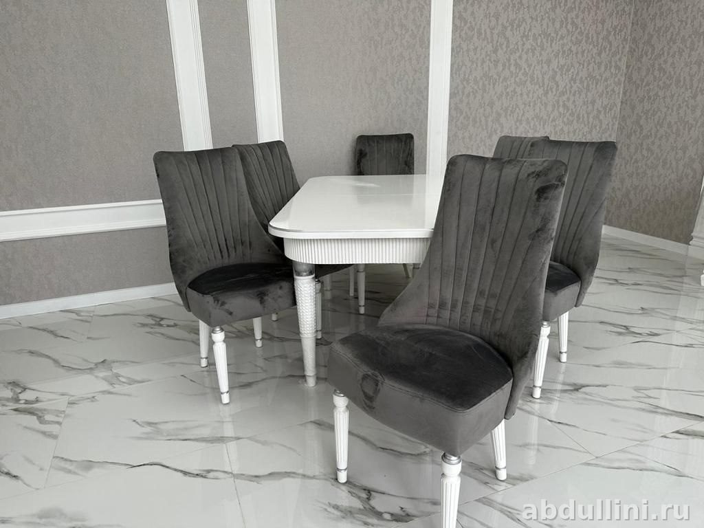 - Стулья: высокая спинка с вертикальными полосами, графитовая велюровая обивка, белые ножки. Цена за стул — 6 500₽.