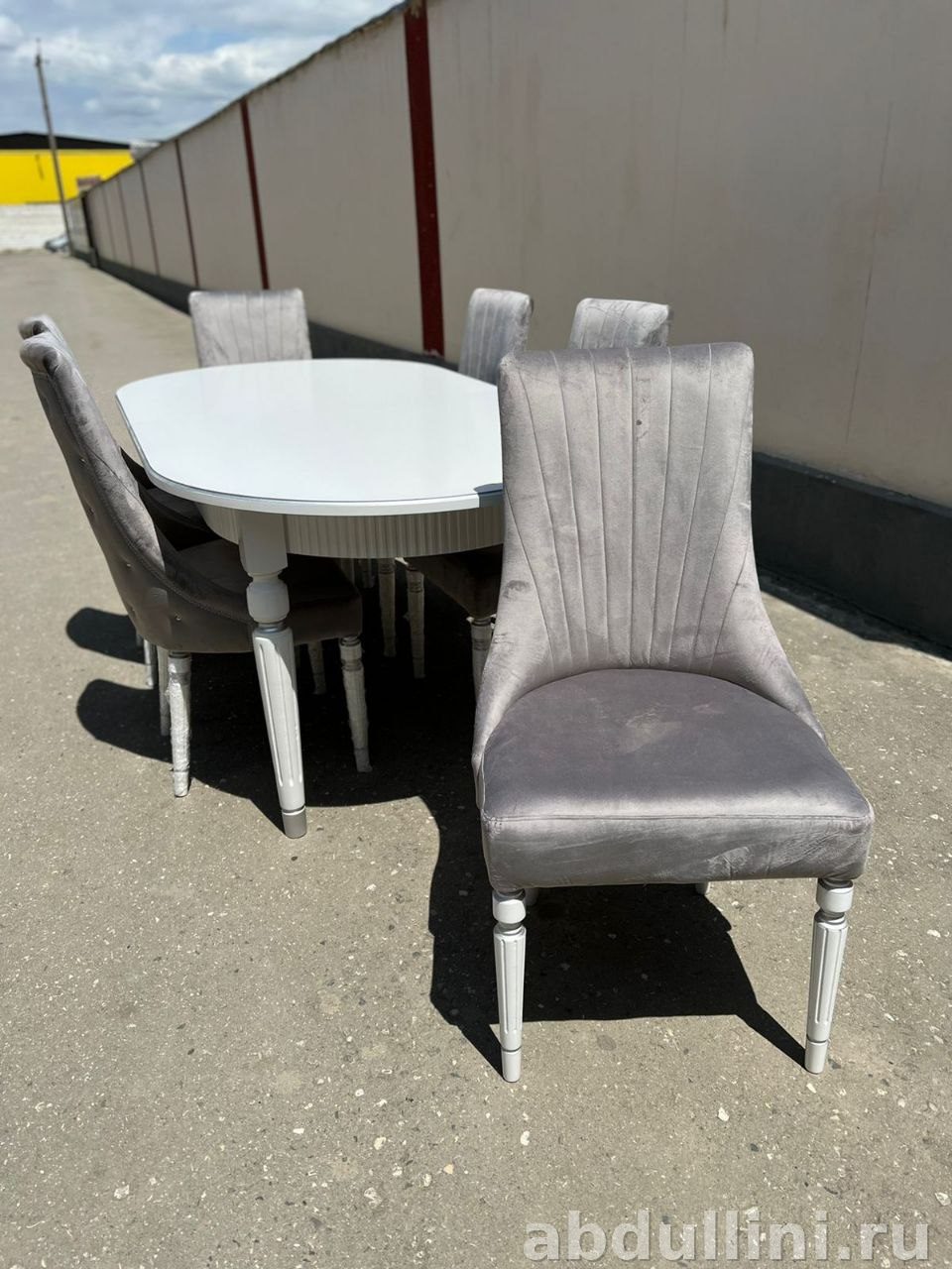Комплект мебели для столовой в стиле неоклассика. Стол с глянцевой белой столешницей и матовыми ножками. Стулья с серой бархатистой обивкой и деревянными ножками.
