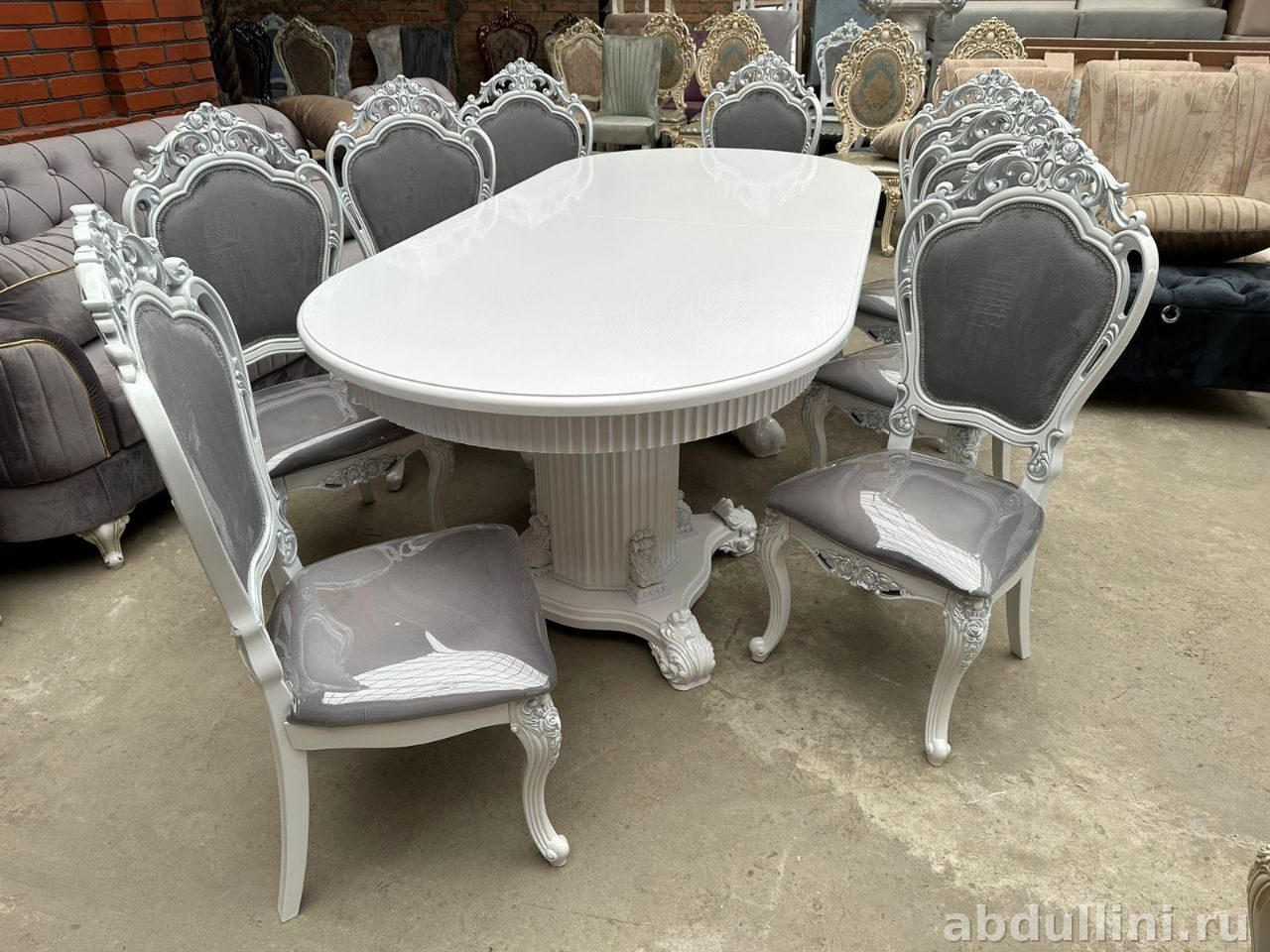 - Стол: раздвижной механизм, белая глянцевая столешница, матовое основание