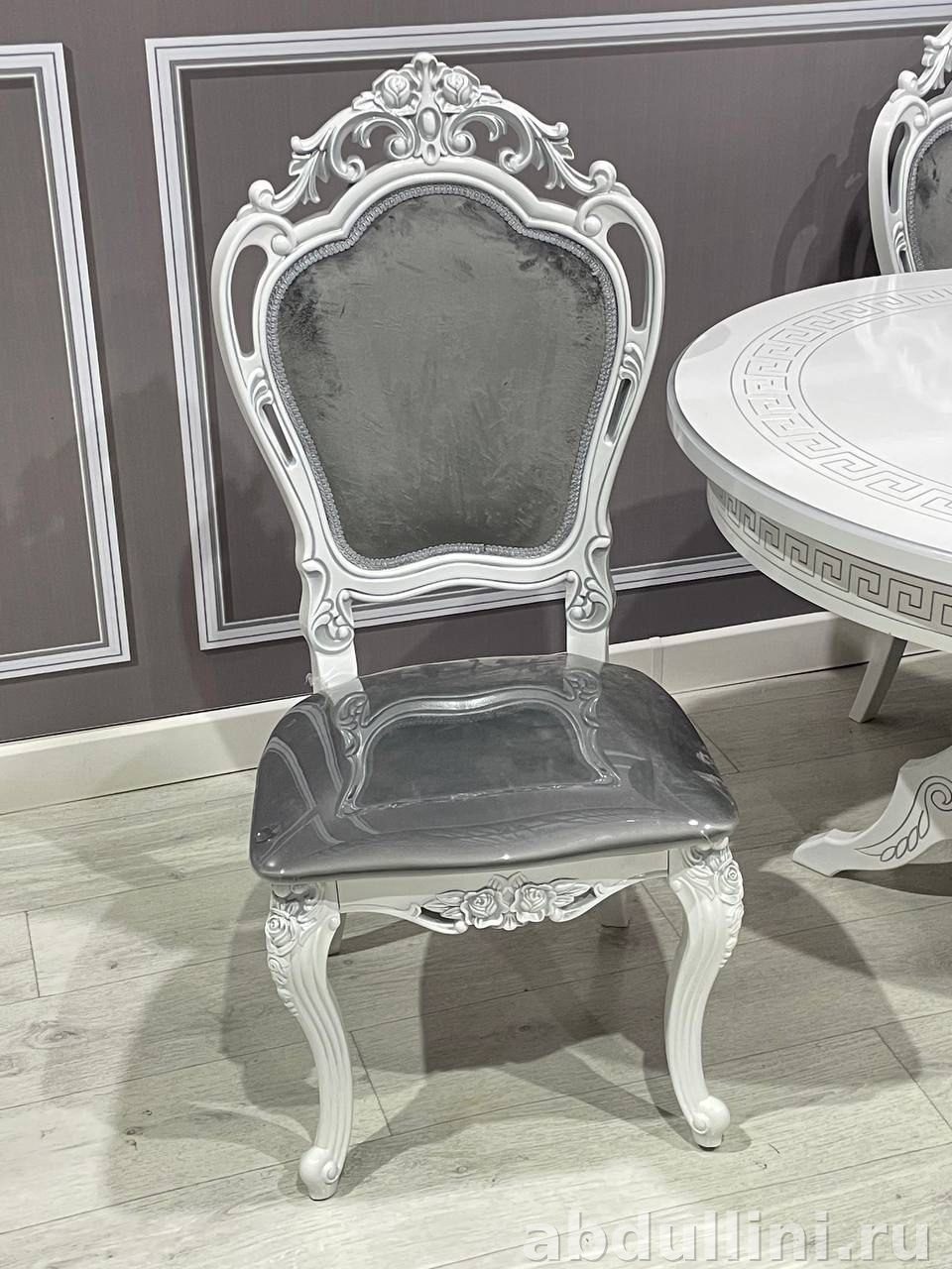 Овальный раздвижной стол 3252 Лапка в белом цвете с серебристыми акцентами. Подходит для обеденной зоны. Комплект включает шесть стульев «Мини-Шейх» с серой обивкой. Стиль – неоклассика, сочетание глянцевых поверхностей и рельефного орнамента в виде греческого меандра.