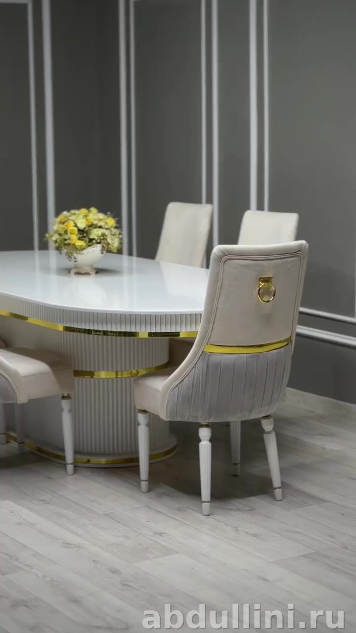 - Стол: овальная столешница (240×110 см), белый глянец с золотистой окантовкой. Центральная опора с ребристой текстурой.