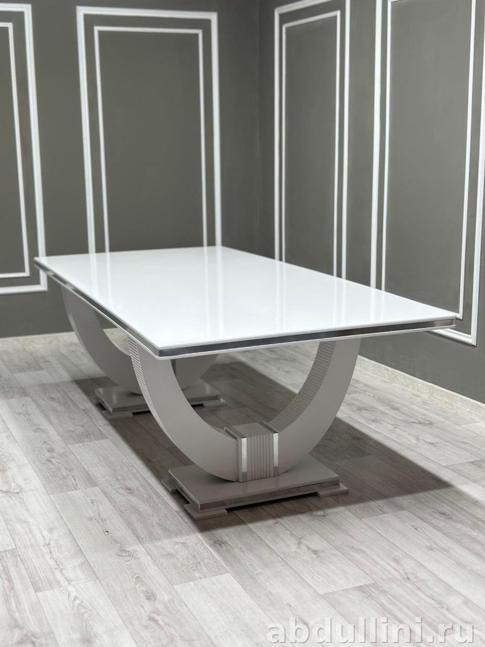 - Стол: прямоугольная столешница 2.4 м (белый глянец), основание с серебристыми вставками. Не раздвижной.