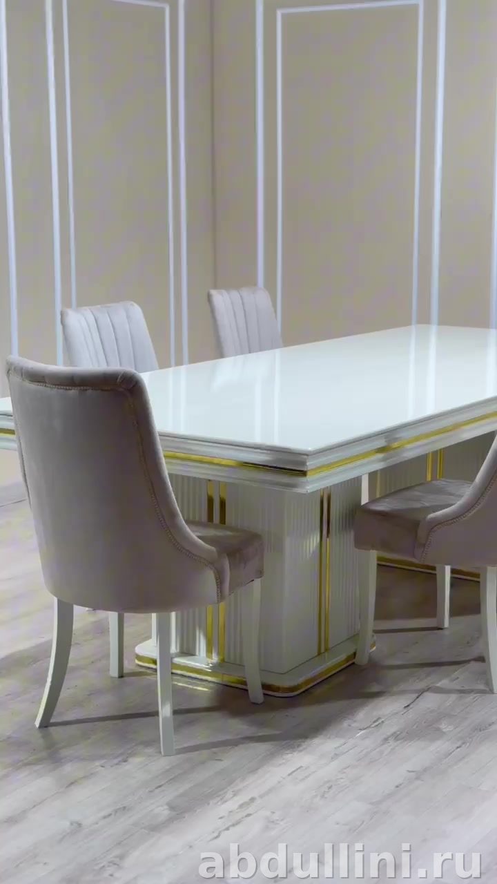 Набор выполнен в современном стиле с акцентом на детали: золотистые элементы стола и мягкая обивка стульев. Стол рассчитан на 6 человек, стулья удобны и устойчивы.