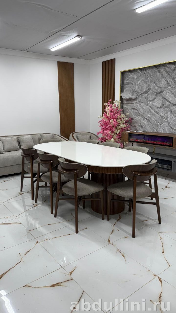 Комплект для столовой: овальный стол на ребристом основании и 6 стульев с текстильной обивкой. Готовое решение для кухни или гостиной.