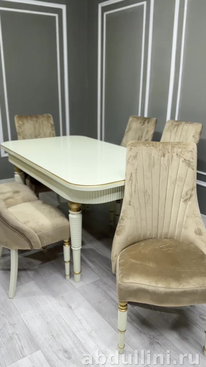 - Стулья «Сурен Ежик»: высокая спинка с вертикальной строчкой, велюровая обивка (бежево-золотистый). Ножки — белые с золотыми вставками.