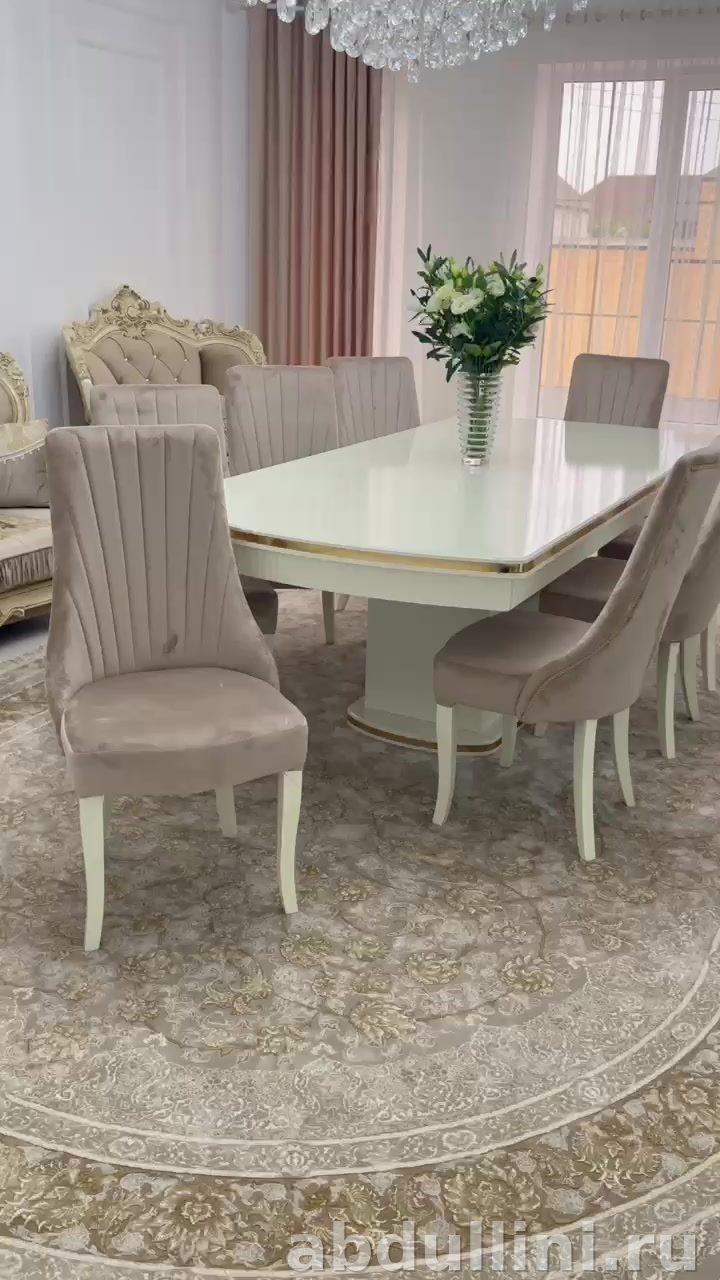 - Стулья «Сурен»: бежевая велюровая обивка с вертикальной прострочкой, белые матовые ножки. В комплекте 6-8 стульев (уточняйте количество при заказе).