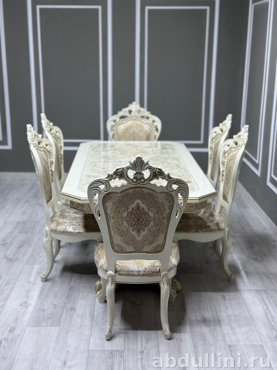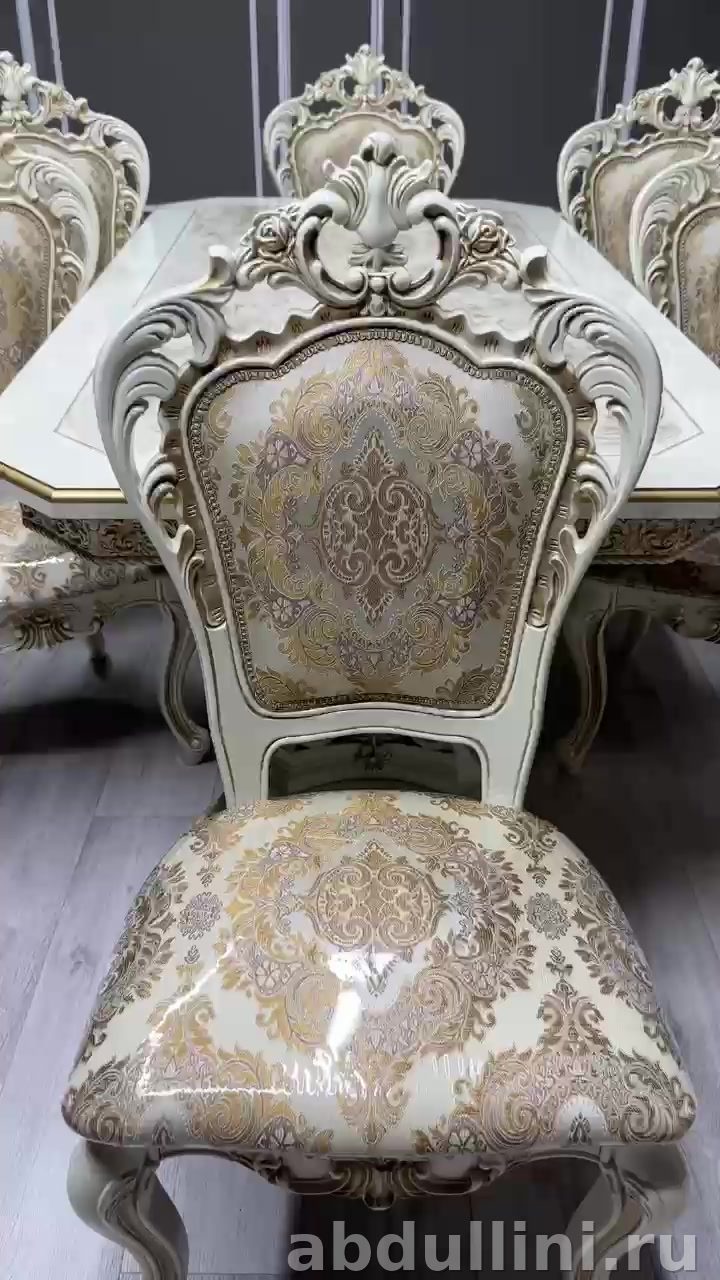 Комплект мебели для обеденной зоны в стиле неоклассика с элементами барокко. Включает раздвижной стол и 6 стульев «Большой Шейх». Цветовая гамма — беж с золотистыми акцентами, что делает комплект универсальным для интерьеров в светлых тонах.