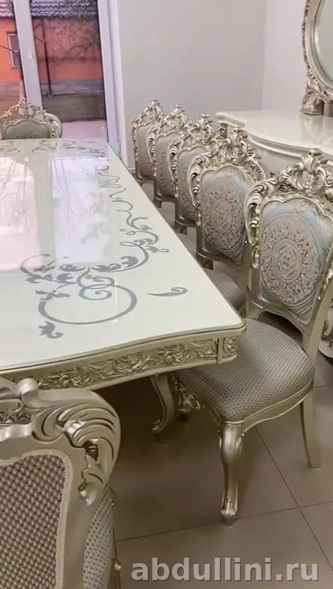 Комплект мебели Маркиза включает обеденный стол и стильные стулья. Произведено в Ставрополе, доступно для заказа в Дагестане. Цветовая гамма — кремовый оттенок с серебристой патиной, что придает мебели красивый и модный вид.