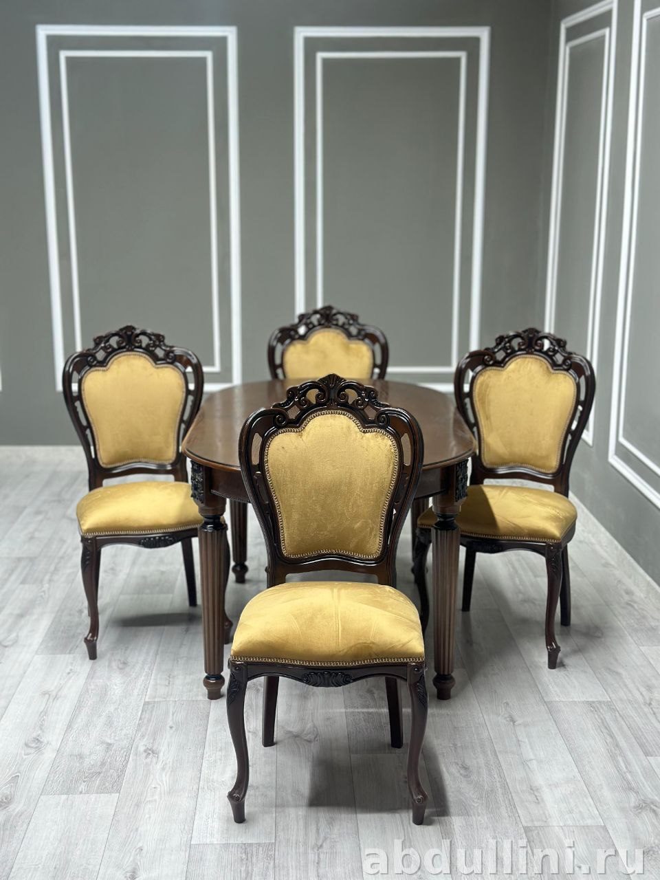 Комплект мебели, состоящий из обеденного стола и четырех стульев, выполнен в классическом стиле с элементами барокко. Подойдет для тех, кто ценит изысканность и функциональность.