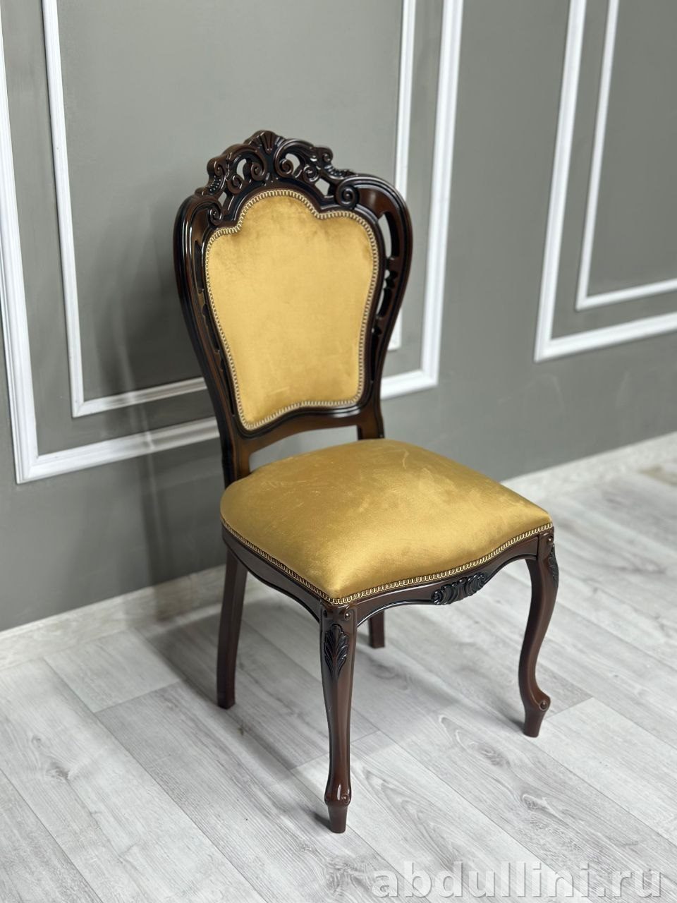 - Каркас стульев — темно-коричневый, обивка сидений и спинок — золотисто-горчичная ткань, похожая на велюр или бархат. Декоративные элементы спинок — черные.