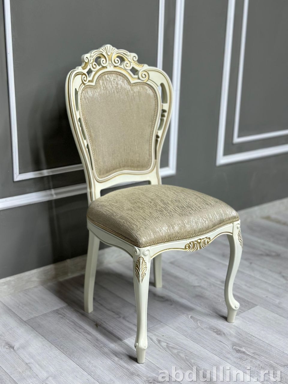 - Стулья Кардинал: высокая спинка с резными элементами, бежевая тканевая обивка, золотистая отделка по контуру.