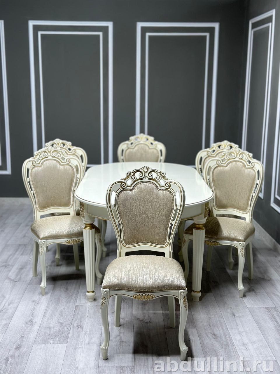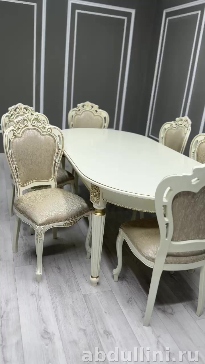 Овальный стол с золотистой отделкой и шесть стульев в классическом стиле. Подходит для обеденной зоны.