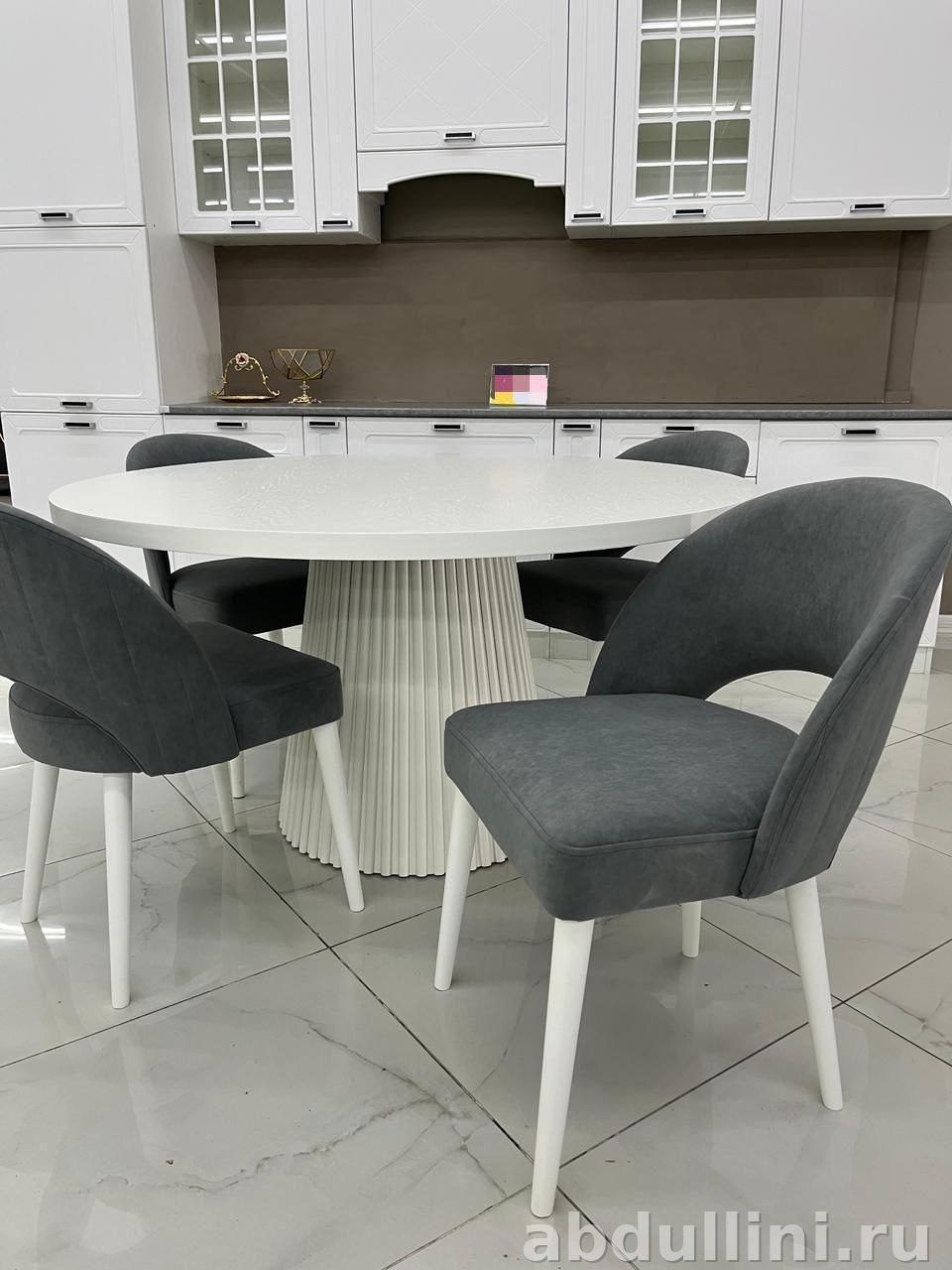 Комплект для столовой в современном стиле с элементами неоклассики. В набор входит круглый стол и 4 стула — всё, что нужно для обеденной зоны.