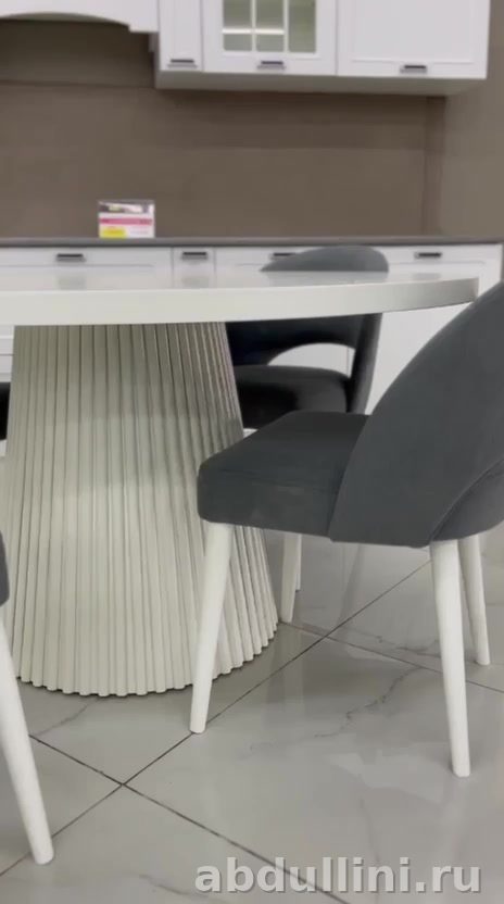 - Стол: круглая столешница (диаметр 140 см), белая матовая поверхность. Основание — цилиндр с вертикальными декоративными элементами, похожими на плиссировку. Высота стандартная — 75 см.