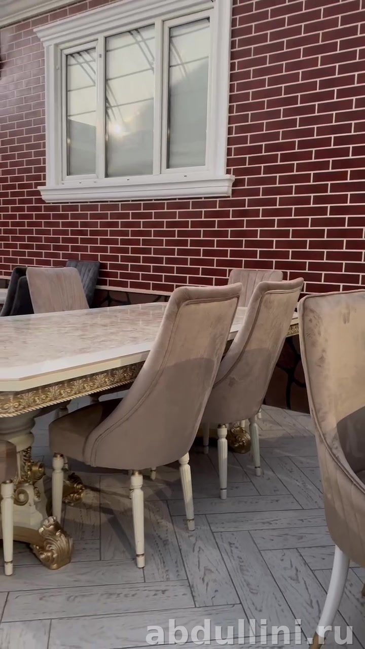 - Стулья: Обивка — мягкий бежевый текстиль, ножки белые, каркас деревянный.