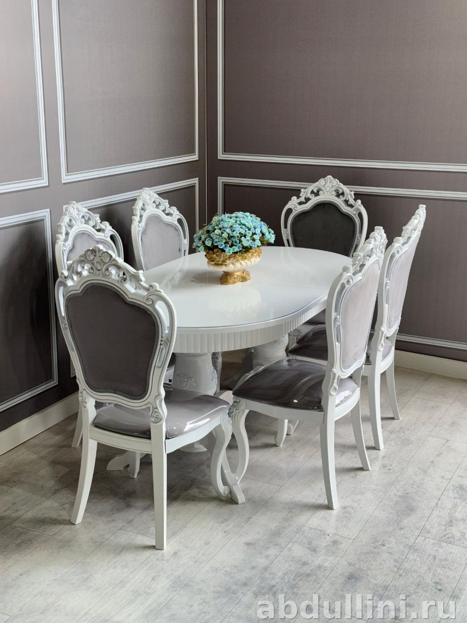- Стулья Мини-Шейх: каркас из массива дерева, обивка — серый велюр. Высокая спинка с резными узорами.