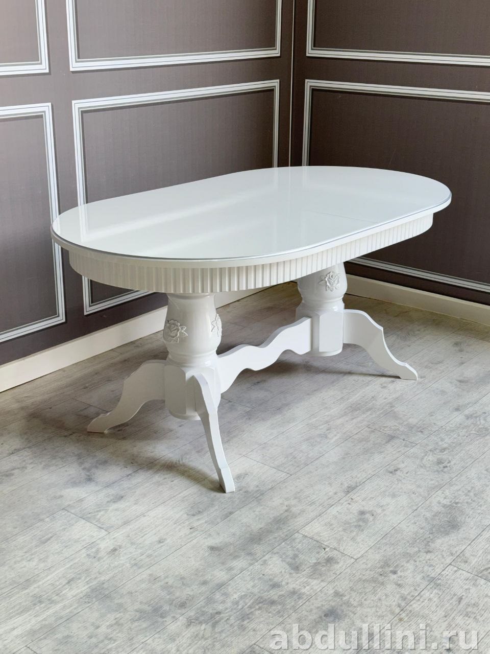 - Стол: длина 160-200 см (раздвигается до 200-240 см), ширина 90-100 см, высота 80 см. Столешница — белая глянцевая, основание — массив дерева с декоративными элементами.