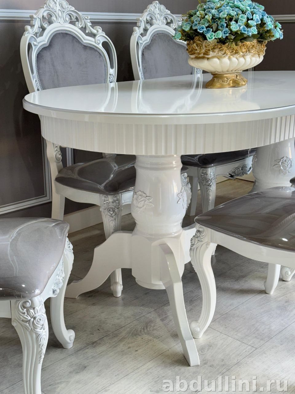 удобный комплект для обеденной зоны в классическом стиле. Стол с рифленой столешницей и раздвижным механизмом, стулья с высокой спинкой и мягкой обивкой.