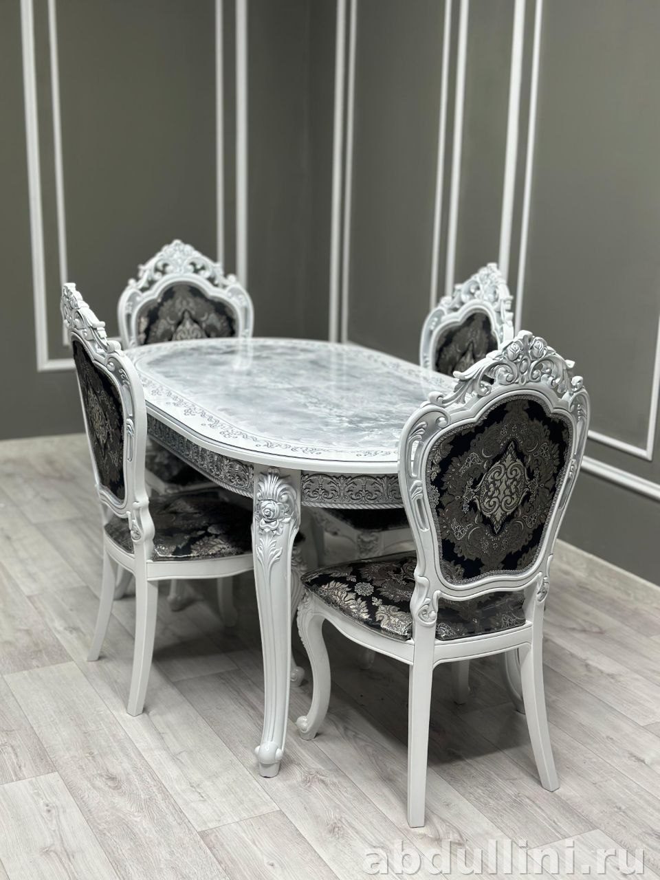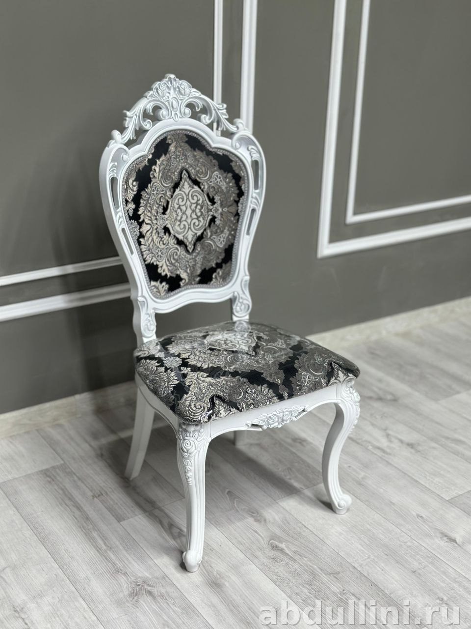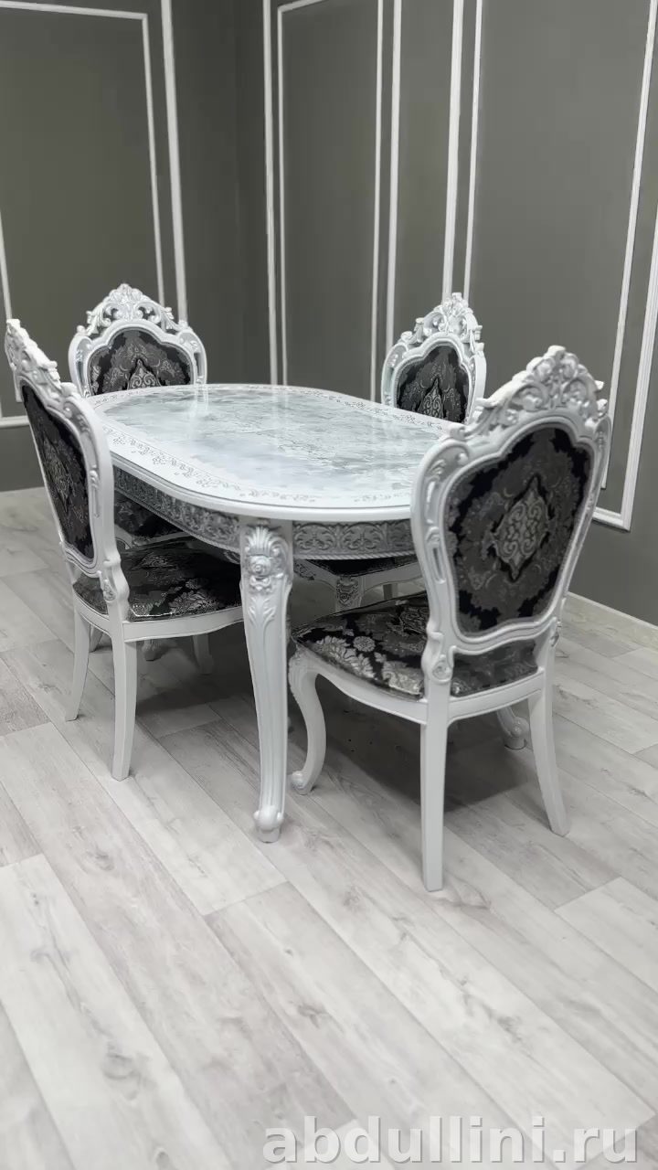 - Стулья «Мини Шейх»: 4 или 5 шт. в комплекте. Каркас — белый глянец с резными ножками, обивка — жаккард с черно-серебристым узором.
