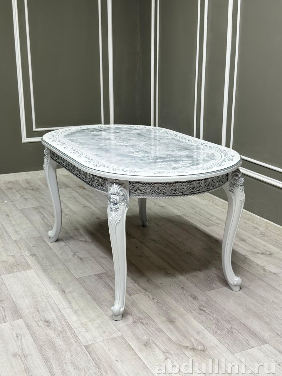 - Стол: раздвижной, столешница — глянцевый белый МДФ с декором под мрамор, каркас — белый глянец с резьбой. Размеры: 120/160 см, 160/200 см, 200/240 см.