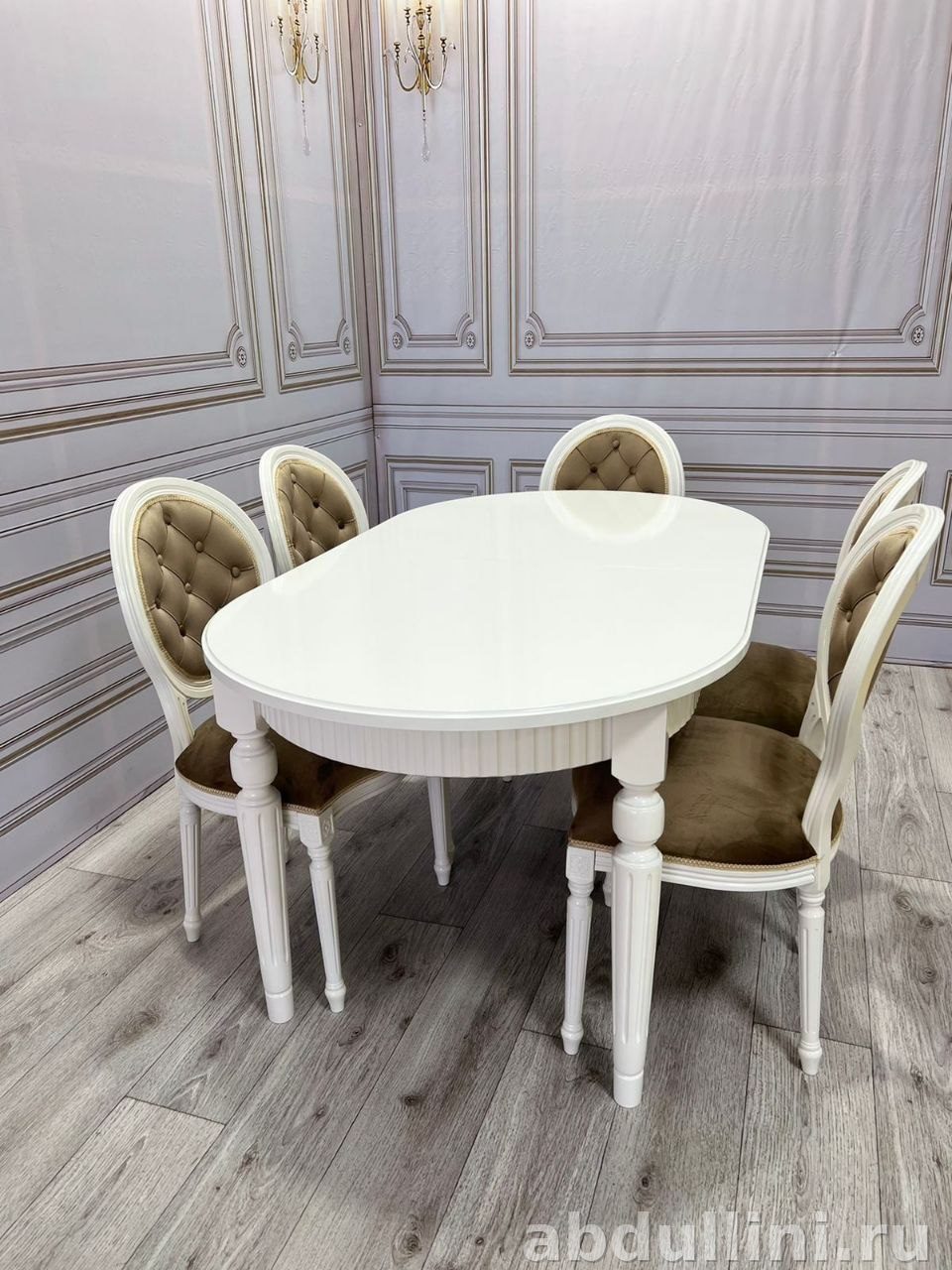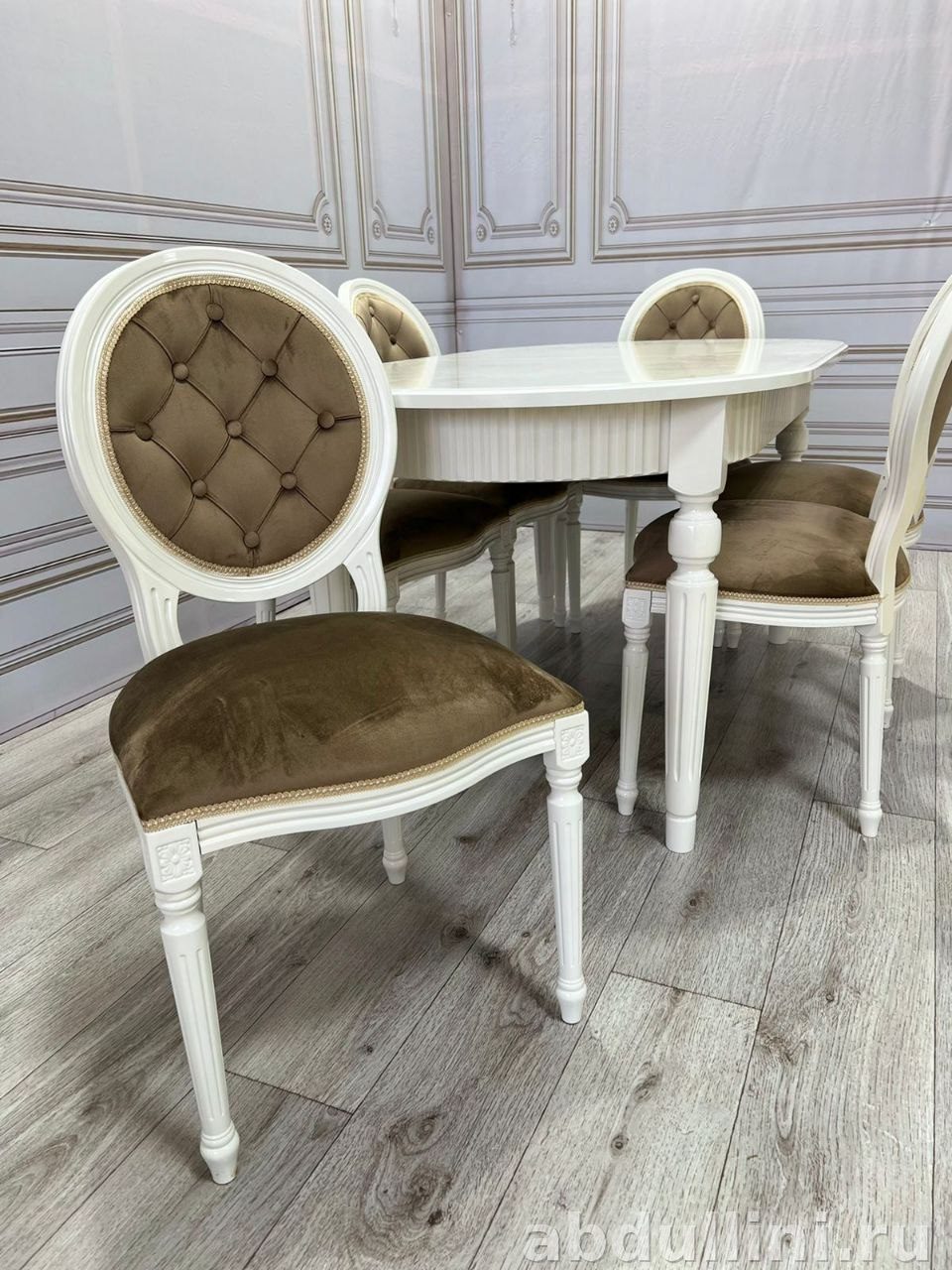 - Стулья (6 шт): белый каркас, коричневая велюровая обивка, декоративная стяжка спинки