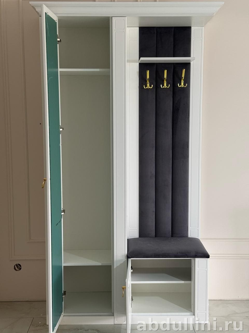 - Конструкция: шкаф с зеркальной дверью и полками внутри, открытая секция с крючками для одежды и мягкой спинкой, тумба с откидной дверцей для хранения обуви.