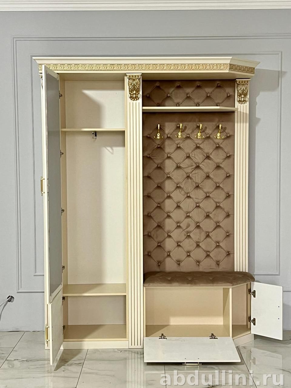 Этот мебельный набор включает всё необходимое для комфортного хранения одежды, обуви и аксессуаров. В комплект входят: шкаф с зеркальной дверью, открытая секция с мягкой панелью и крючками, а также тумба с мягким сиденьем и ящиком. Каждый элемент продуман до мелочей, чтобы максимально использовать пространство.