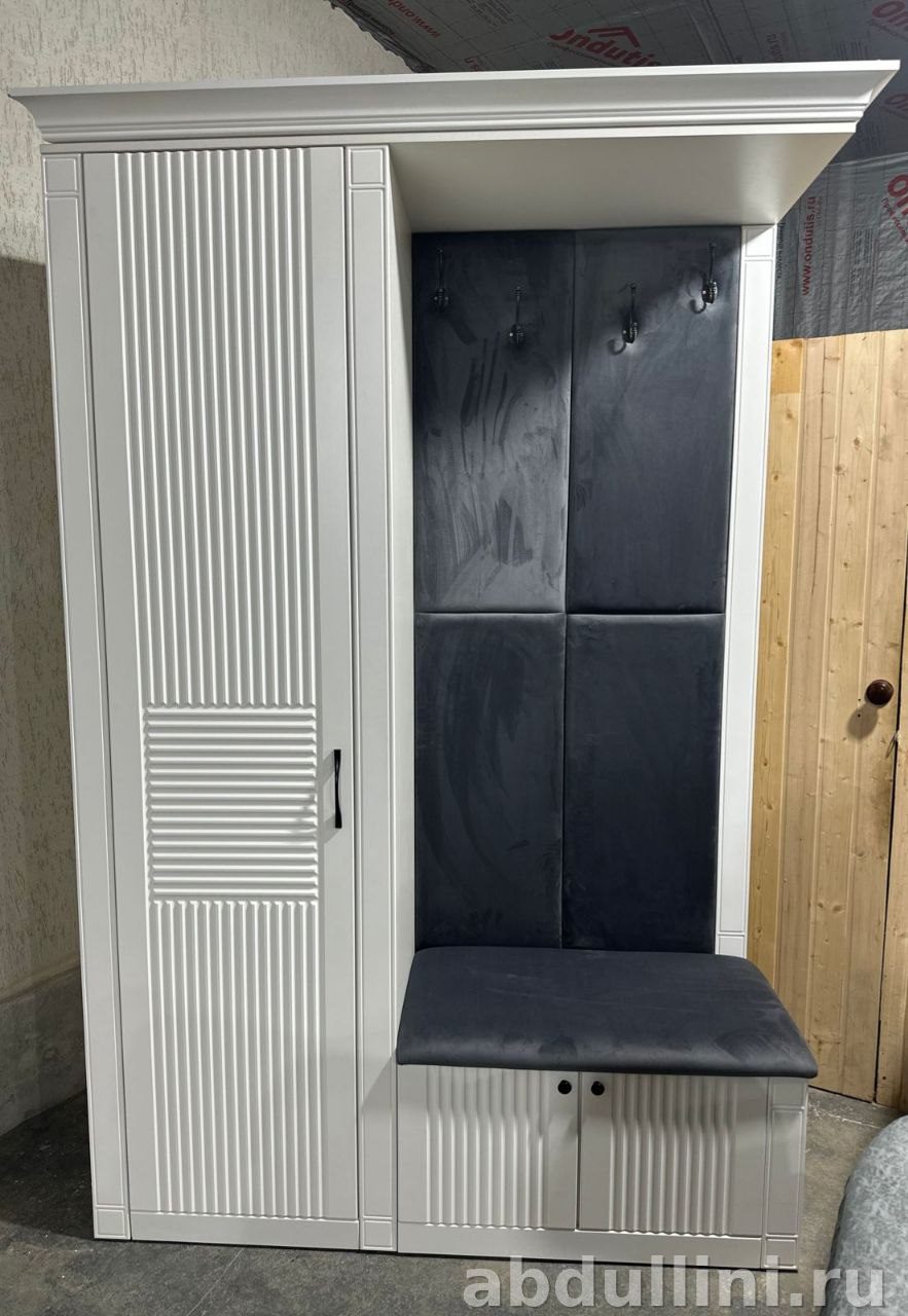 Белый комплект для прихожей с удобным сиденьем и местом для хранения. Размеры: 150×235×52 см. В комплекте шкаф для одежды, мягкая скамья с крючками и тумба.