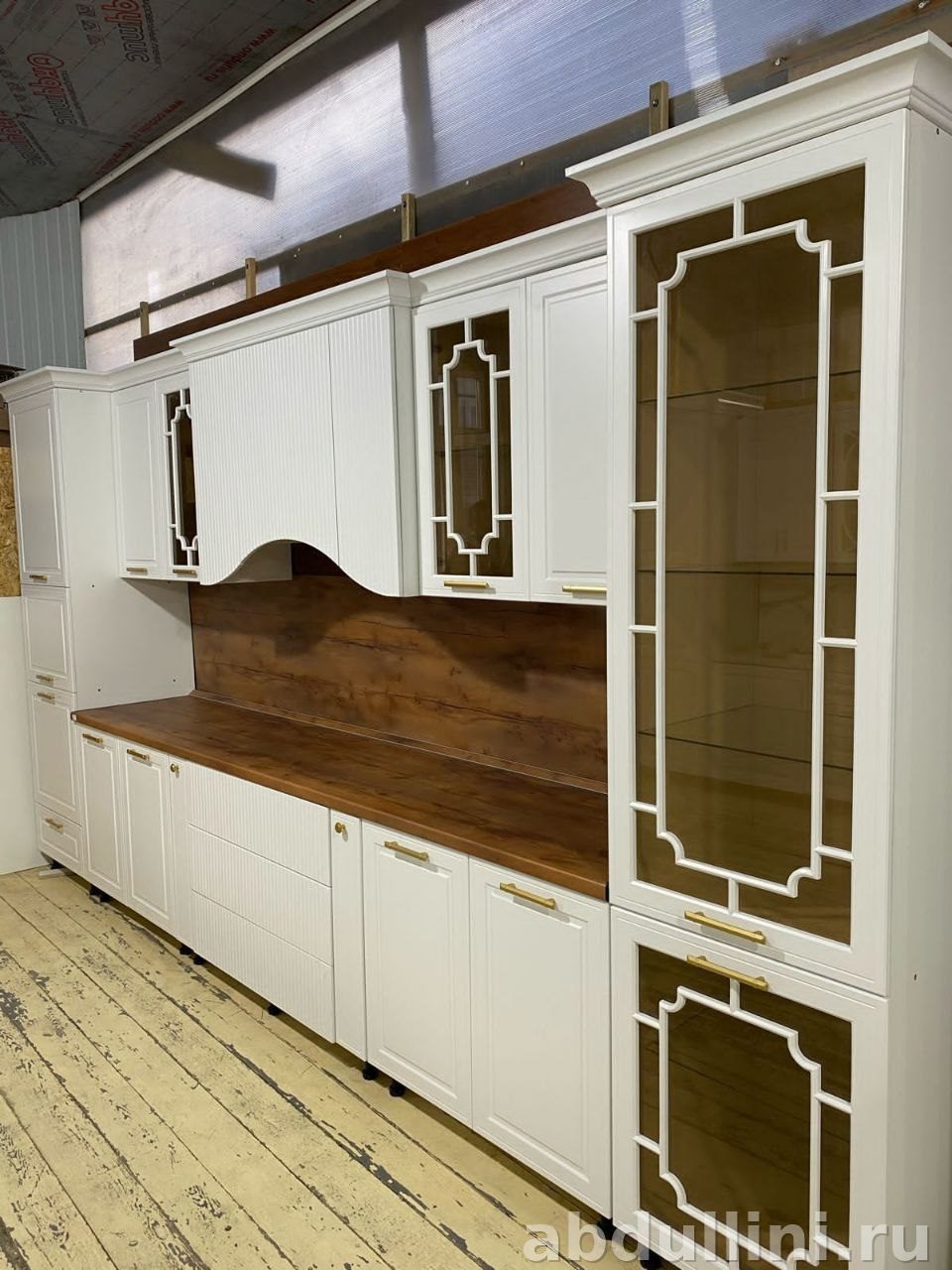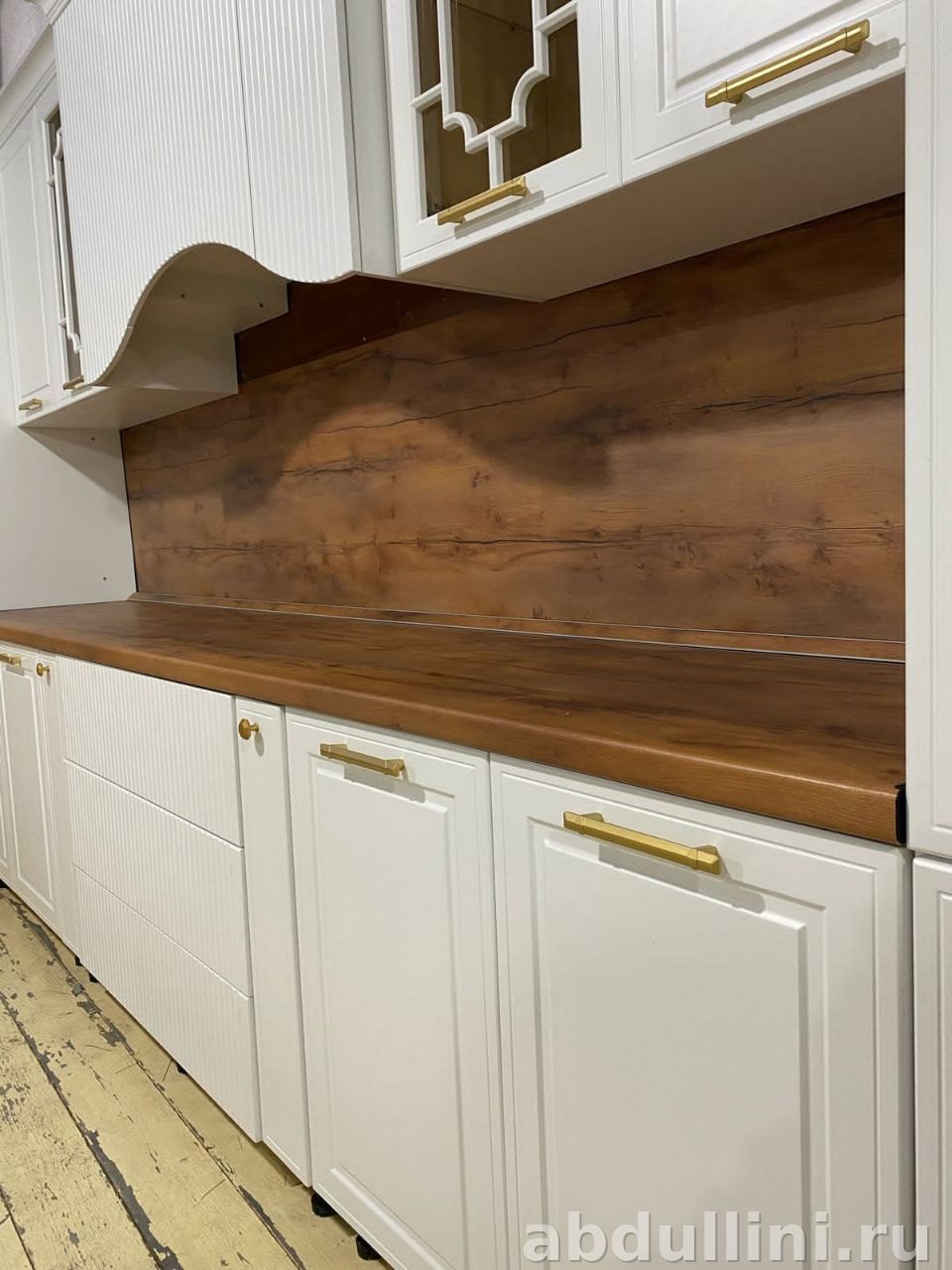 - Верхние шкафы: 2 глухих, 2 со стеклянными дверцами (геометрическая раскладка), 2 с рифлёными фасадами.