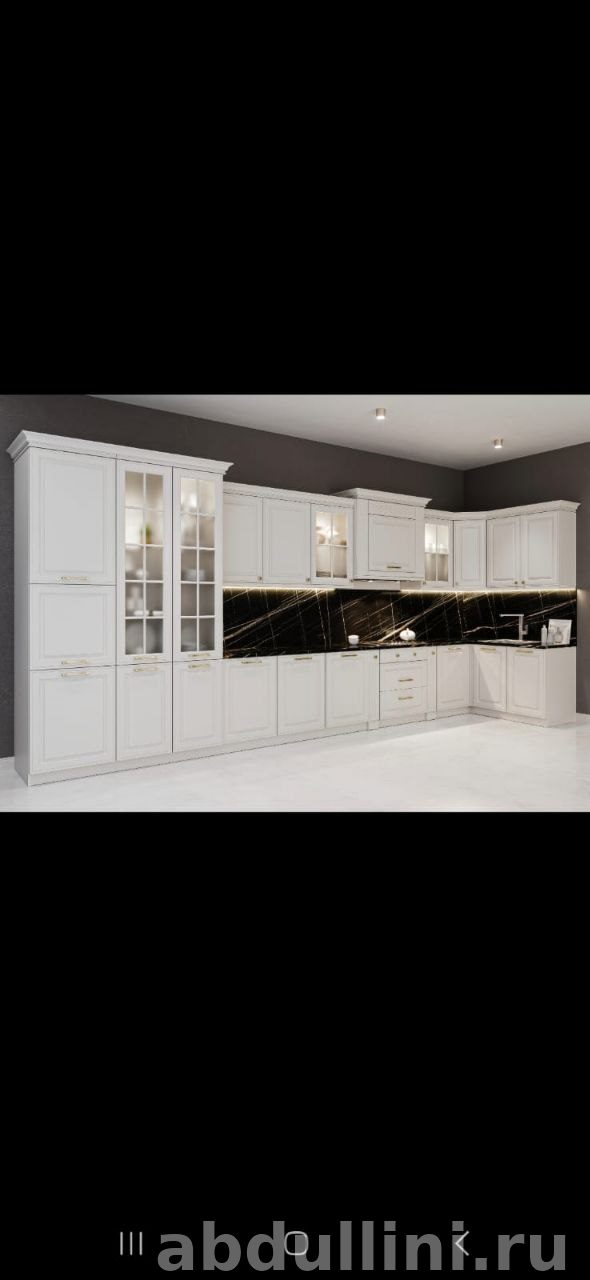 Готовый кухонный гарнитур в стиле неоклассика. Размер 5.10*1.50 м. В комплекте стеновой карниз. Фасады из матового МДФ, корпуса из ЛДСП. Столешница — черный мрамор с золотистыми прожилками.