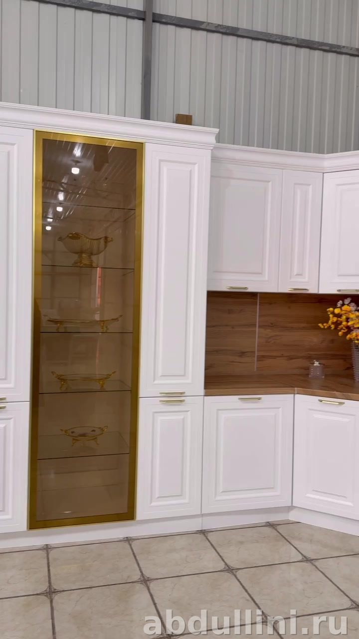 - Особенности: матовая отделка, фрезеровка на фасадах, золотистая фурнитура, тонированное стекло в витрине