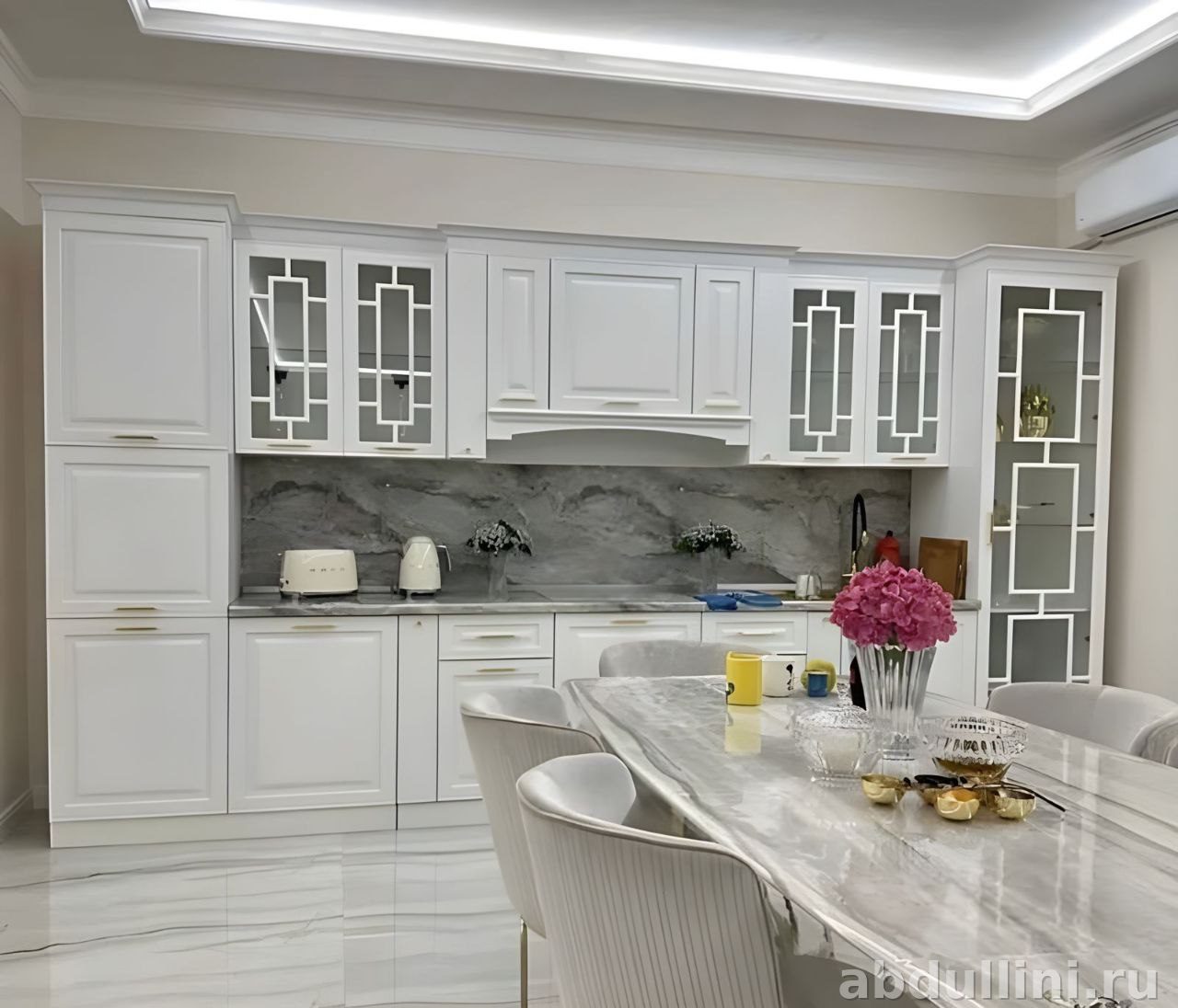 Белая кухня в современном стиле с продуманной комплектацией. Корпус из ЛДСП, фасады — матовый МДФ. В комплекте напольные и навесные шкафы с глухими дверцами и стеклянными вставками.
