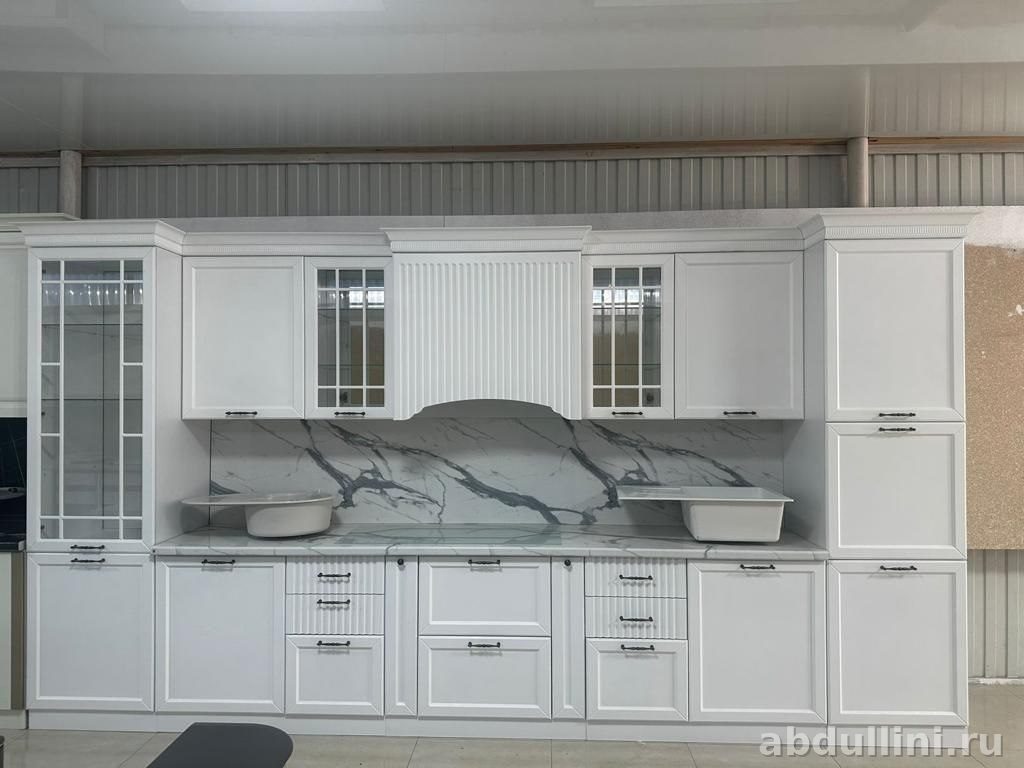 Модульная кухня в белом матовом исполнении с продуманной комплектацией. Подходит для просторных помещений — длина 420 см, высота 245 см, глубина 60 см. Фасады из МДФ с эмалью, корпус — ЛДСП. Столешница и фартук имитируют мрамор с серыми прожилками.