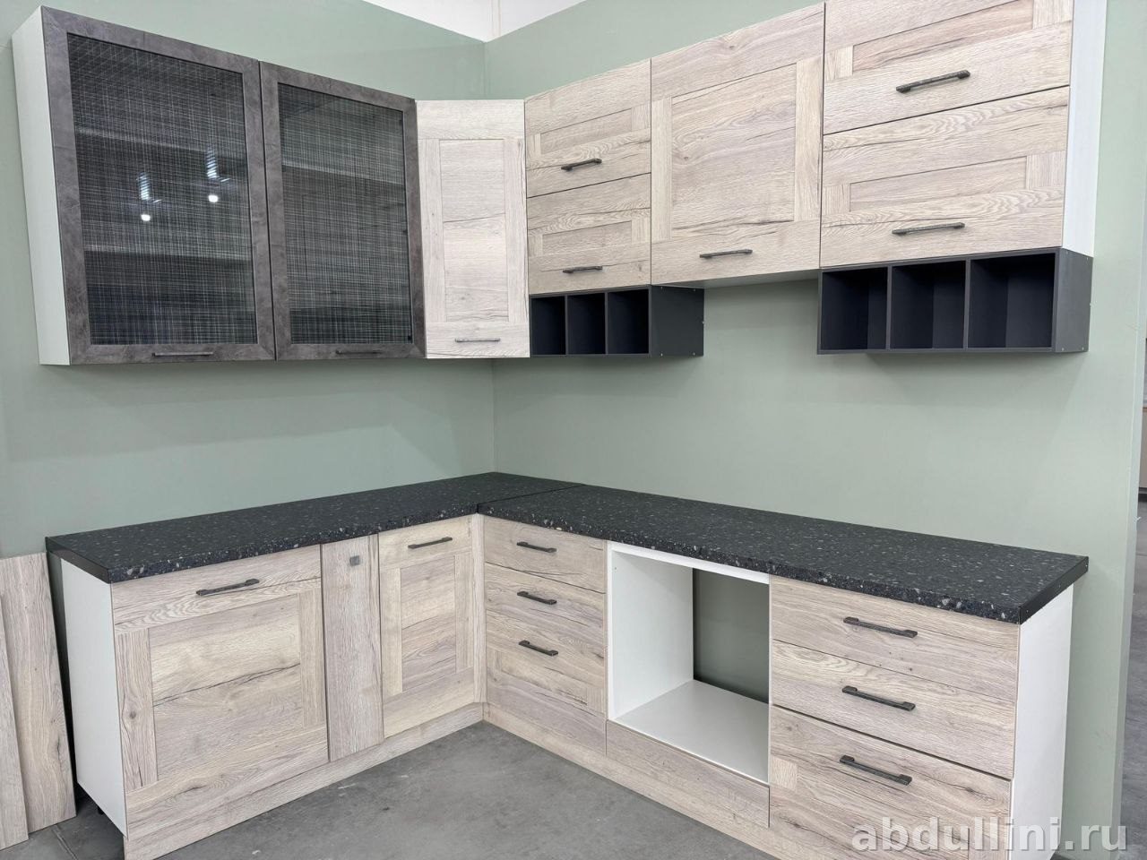 удобный и стильный гарнитур для кухни в современном стиле. Светлые фасады с текстурой дуба галифакс белый, темная столешница с мелкими вкраплениями. Фурнитура — матовые черные ручки.