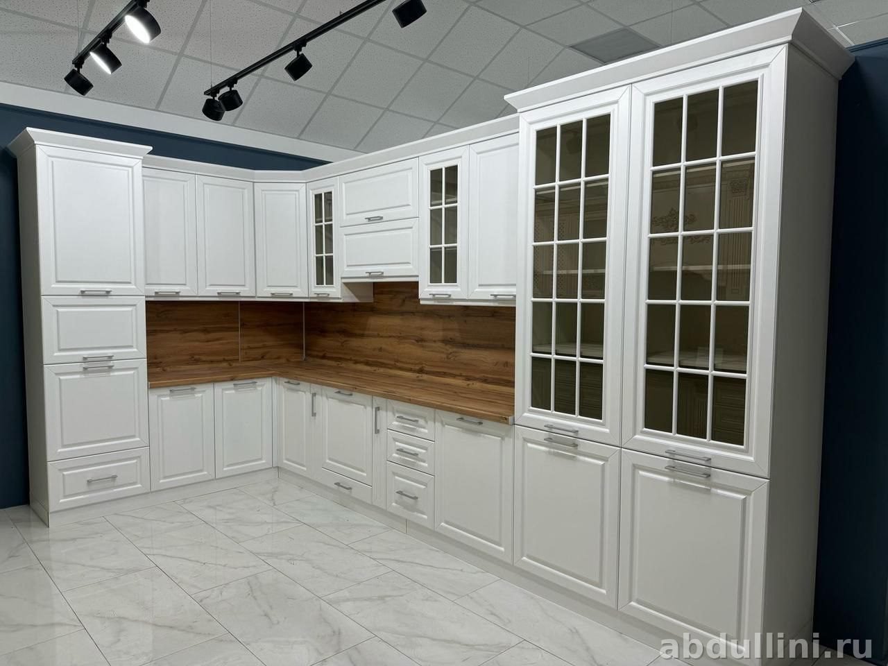 Фасады шкафов украшены фрезеровкой, что добавляет элегантности. Столешница и фартук выполнены из материала, имитирующего текстуру дерева, создавая приятный контраст с белыми фасадами.