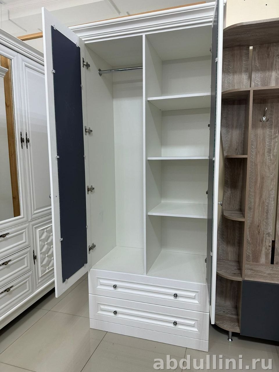 - Конструкция: две секции с распашными дверцами. В одной — штанга для вешалок, в другой — полки для хранения. Внизу — два выдвижных ящика с шариковыми направляющими.