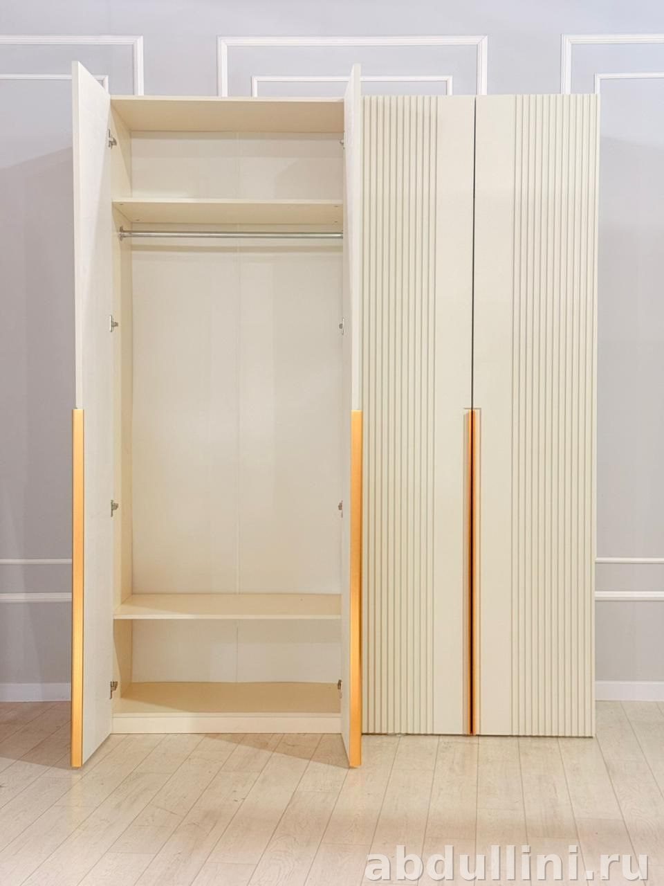 Шкаф выполнен в светлом бежевом цвете с матовой поверхностью. Вертикальные полосы на дверях добавляют рельеф, а золотистые ручки — изысканность. Подойдет для спальни, гостиной или прихожей.