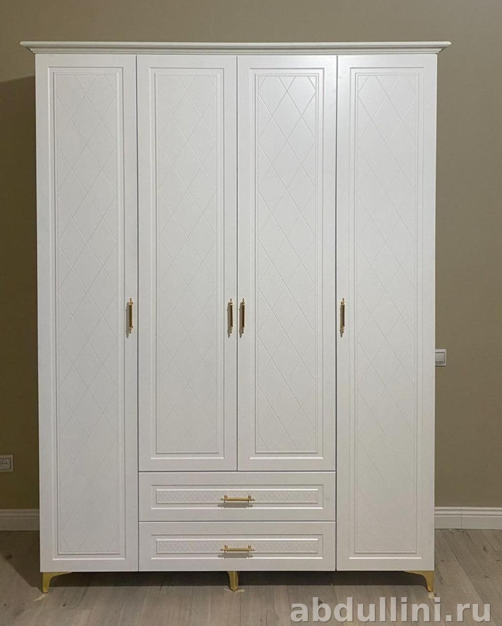 Четырехстворчатый шкаф с двумя выдвижными ящиками. Размеры: ширина 160 см, высота 210 см, глубина 40 см. Доступен в белом и бежевом цветах.