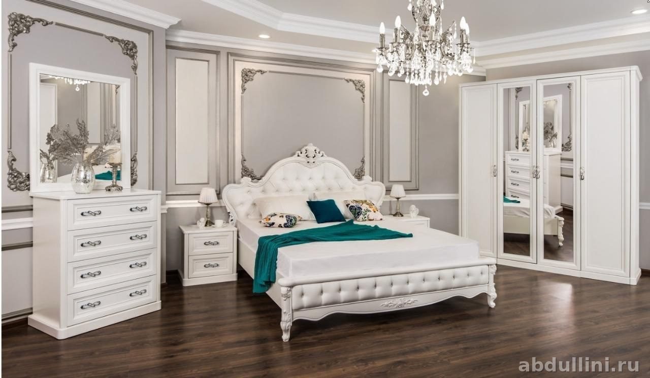Материалы: каркас из МДФ или ЛДСП с отделкой эмалью, изголовье кровати — экокожа или текстиль. Все элементы декора продуманы до мелочей: резные узоры, молдинги на стеновых панелях, витиеватые ручки.