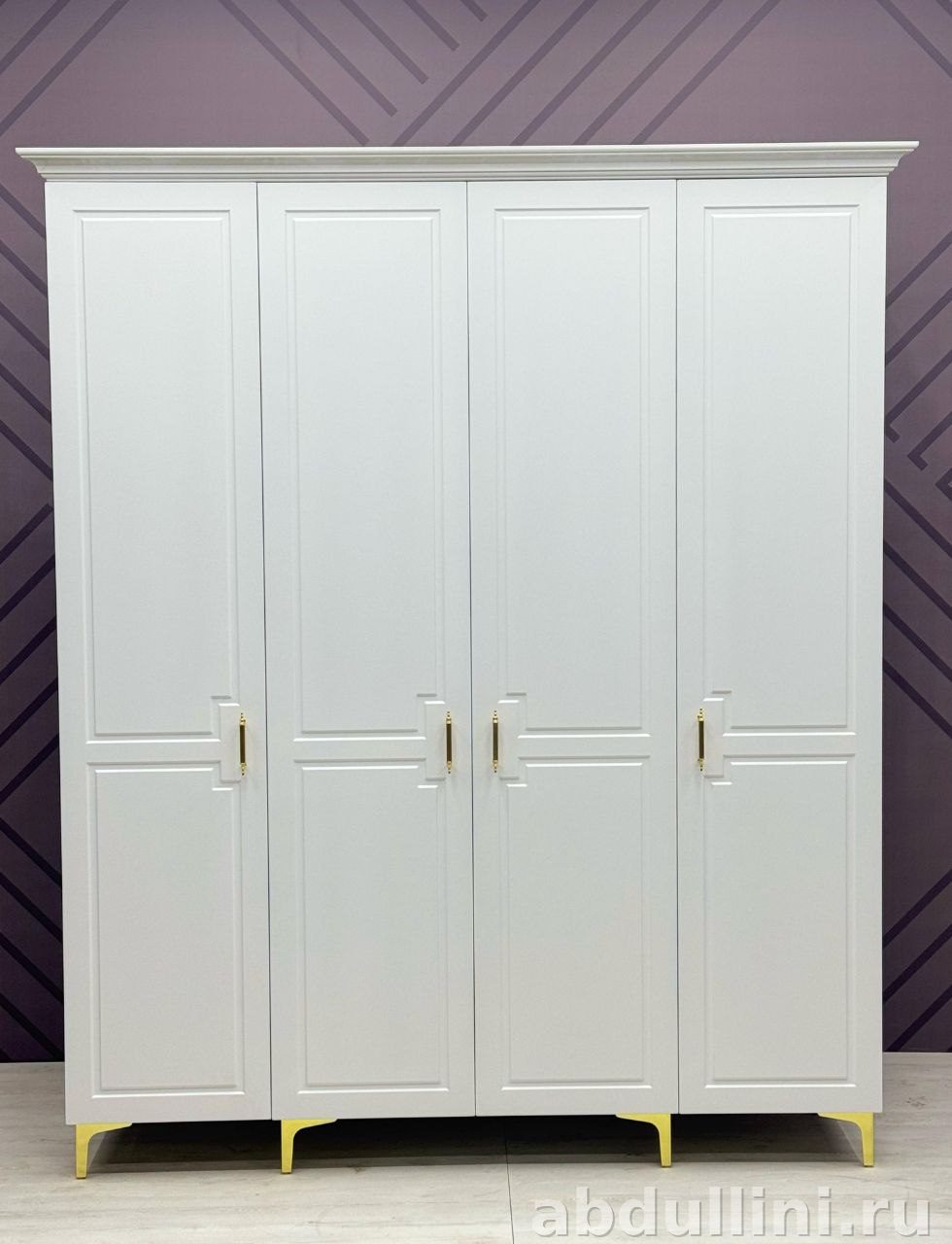Просторный шкаф для одежды с четырьмя распашными дверцами. Выполнен в белом цвете с матовой поверхностью. Декоративные рамки на дверцах создают эффект филенки, а золотистые ручки и ножки добавляют изысканности.