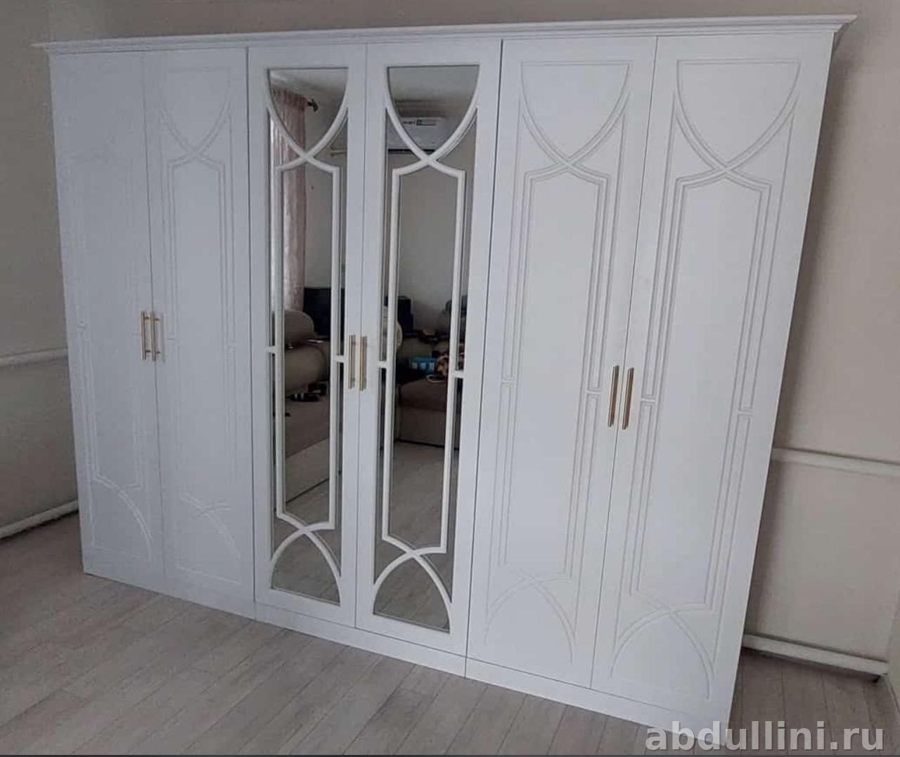 Шкаф выполнен в белом матовом цвете, что делает его универсальным для любого интерьера. В комплекте шесть секций: четыре с глухими дверцами и две с зеркальными. Зеркальные дверцы визуально расширяют пространство, а декоративные геометрические узоры добавляют изысканности. Ручки золотистого цвета — акцентный элемент, который подчеркивает стиль.