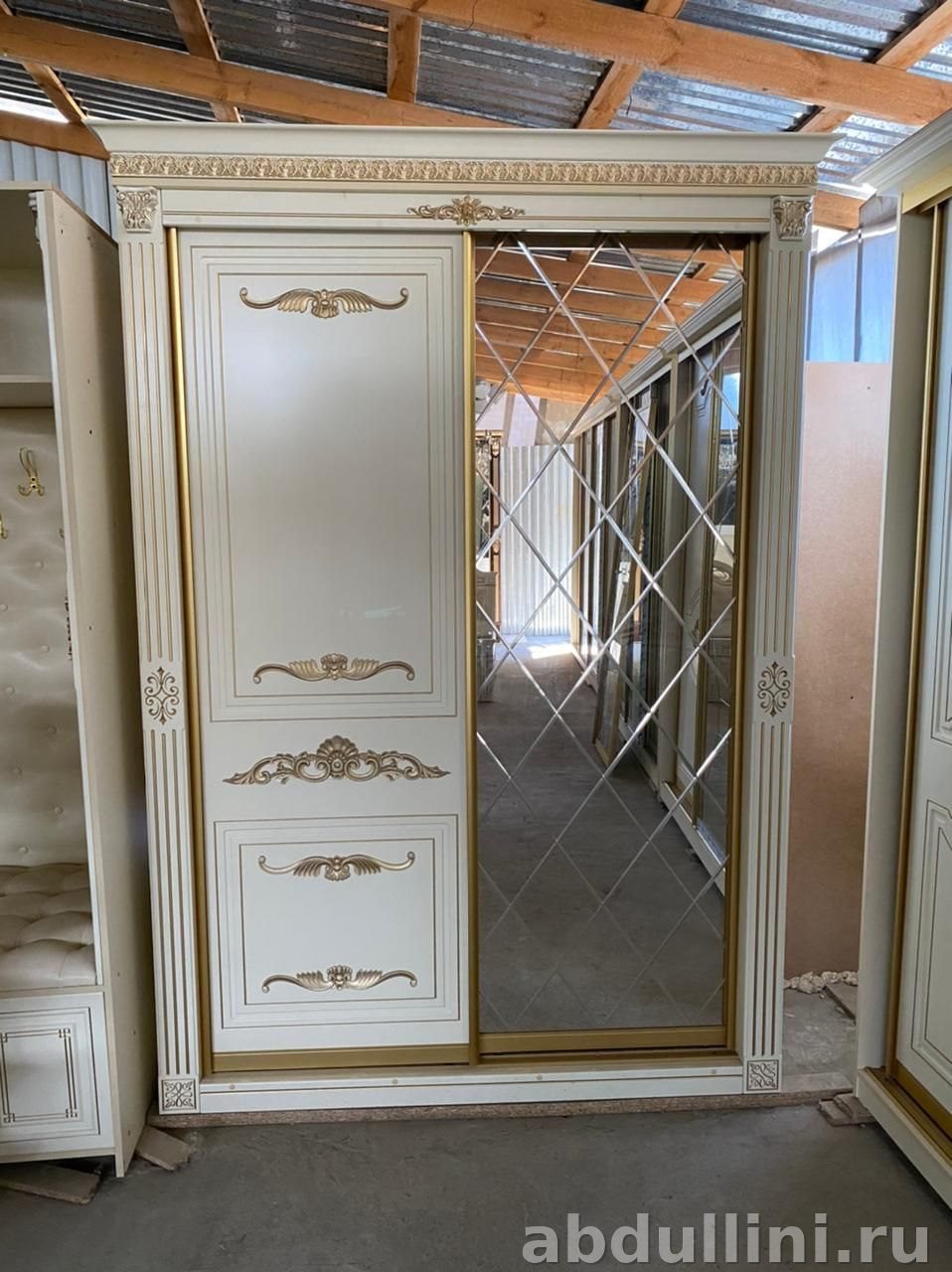 Этот мебельный гарнитур включает шкаф-купе и тумбу с мягким сиденьем. Основной цвет — слоновая кость (кремовый оттенок белого), отделка — золотистая патина, добавляющая акценты. Глянцевая поверхность дверей шкафа сочетается с золотистыми узорами в виде растительных мотивов. Лепнина и ромбовидный узор из фацетированных зеркал дополняют эстетику.